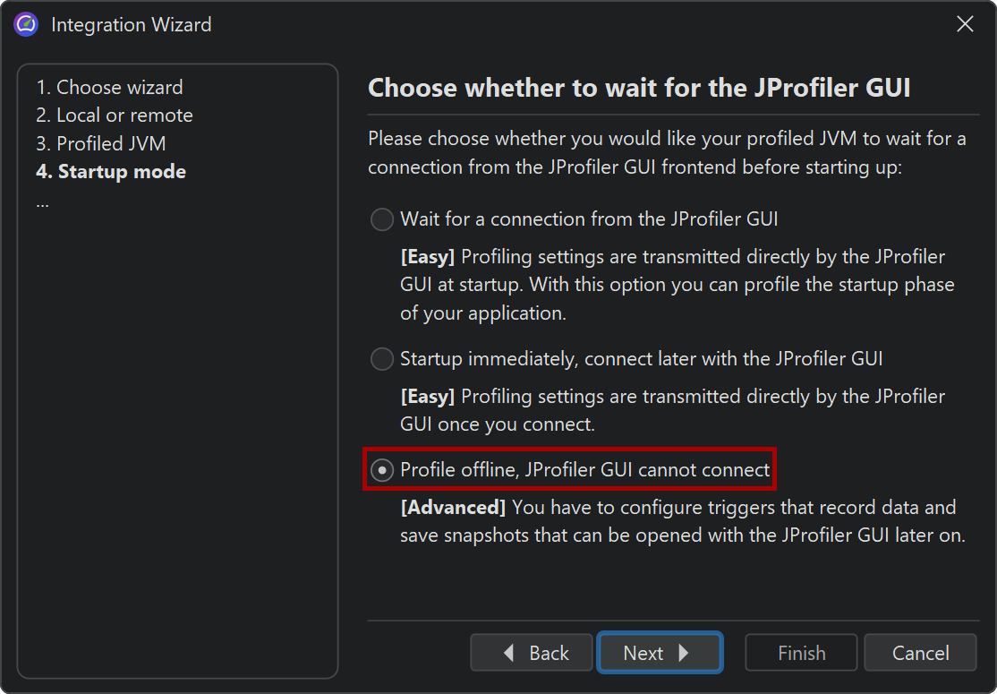 There are situations where you would like to profile without the JProfiler GUI and analyze the results later on. For this scenario, JProfiler offers offline profiling. Offline profiling allows you to start the profiled application with the profiling agent but without the need to connect with a JProfiler GUI.