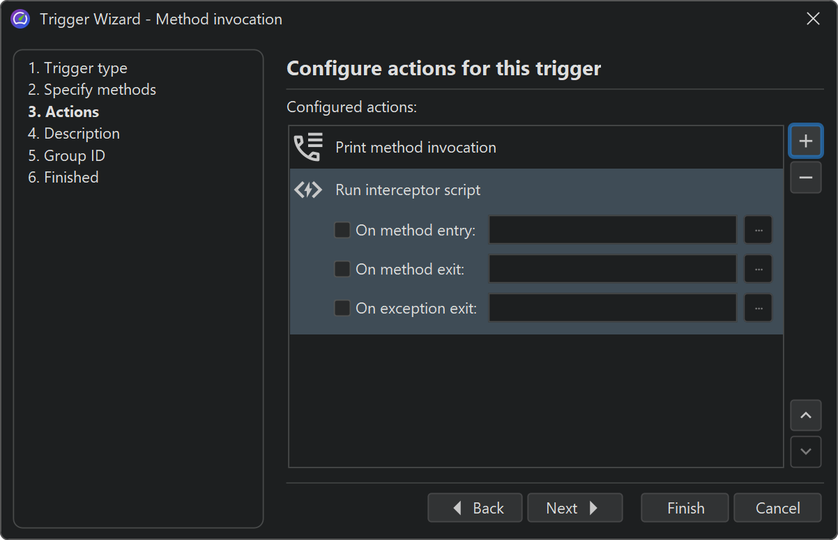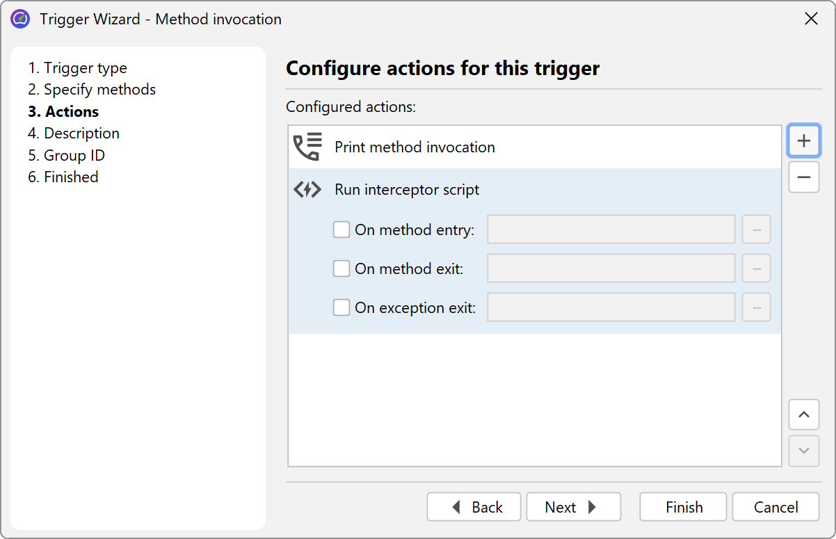 Each trigger has a list of actions that are performed when the associated event occurs. Some of these actions correspond to profiling actions in the controller API. In addition, there are other actions that go beyond the controller functionality such as the action to print method calls with parameters and return values or the action to invoke interceptor scripts for a method.