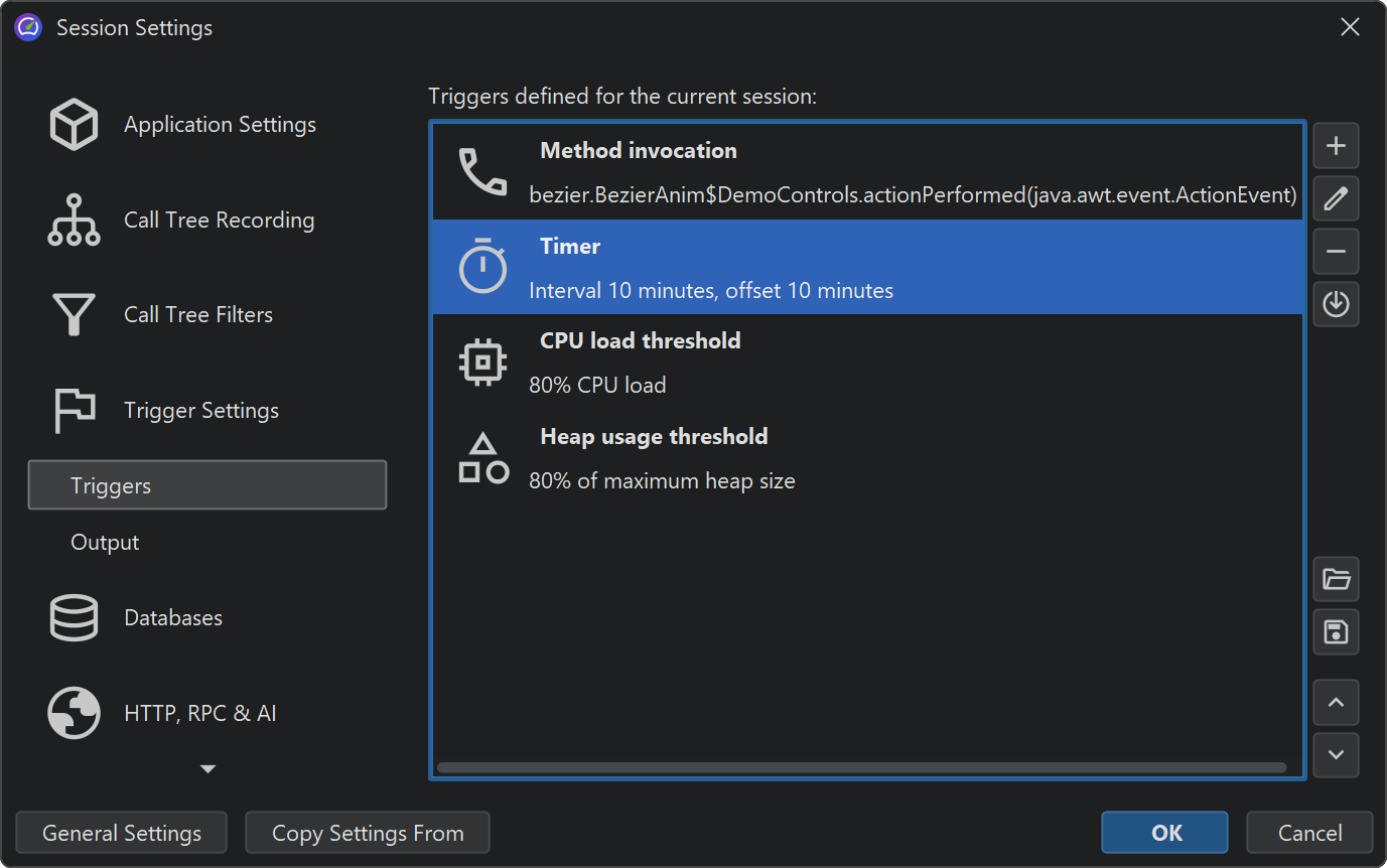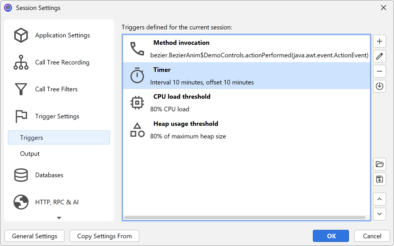 With triggers, you can specify all profiling actions in the JProfiler GUI without modifying your source code. Triggers are saved in the JProfiler config file. The config file and the session ID are passed to the profiling agent on the command line when you start with offline profiling enabled, so the profiling agent can read those trigger definitions.