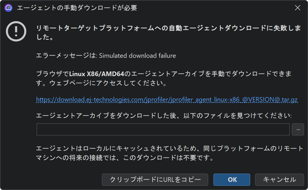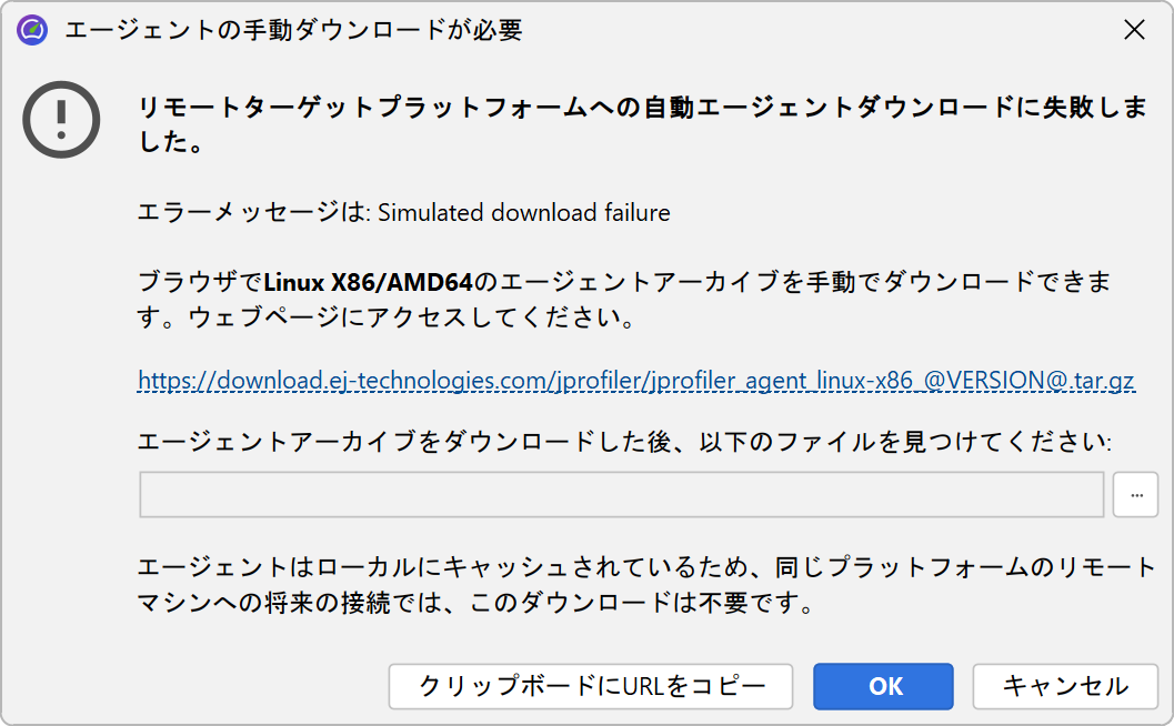 エージェントファイルはキャッシュされるため、これは各リモートプラットフォームごとに一度だけ必要な操作です。JProfilerがアップデートされるとエージェントが変更されるため、再度ダウンロードが必要になります。