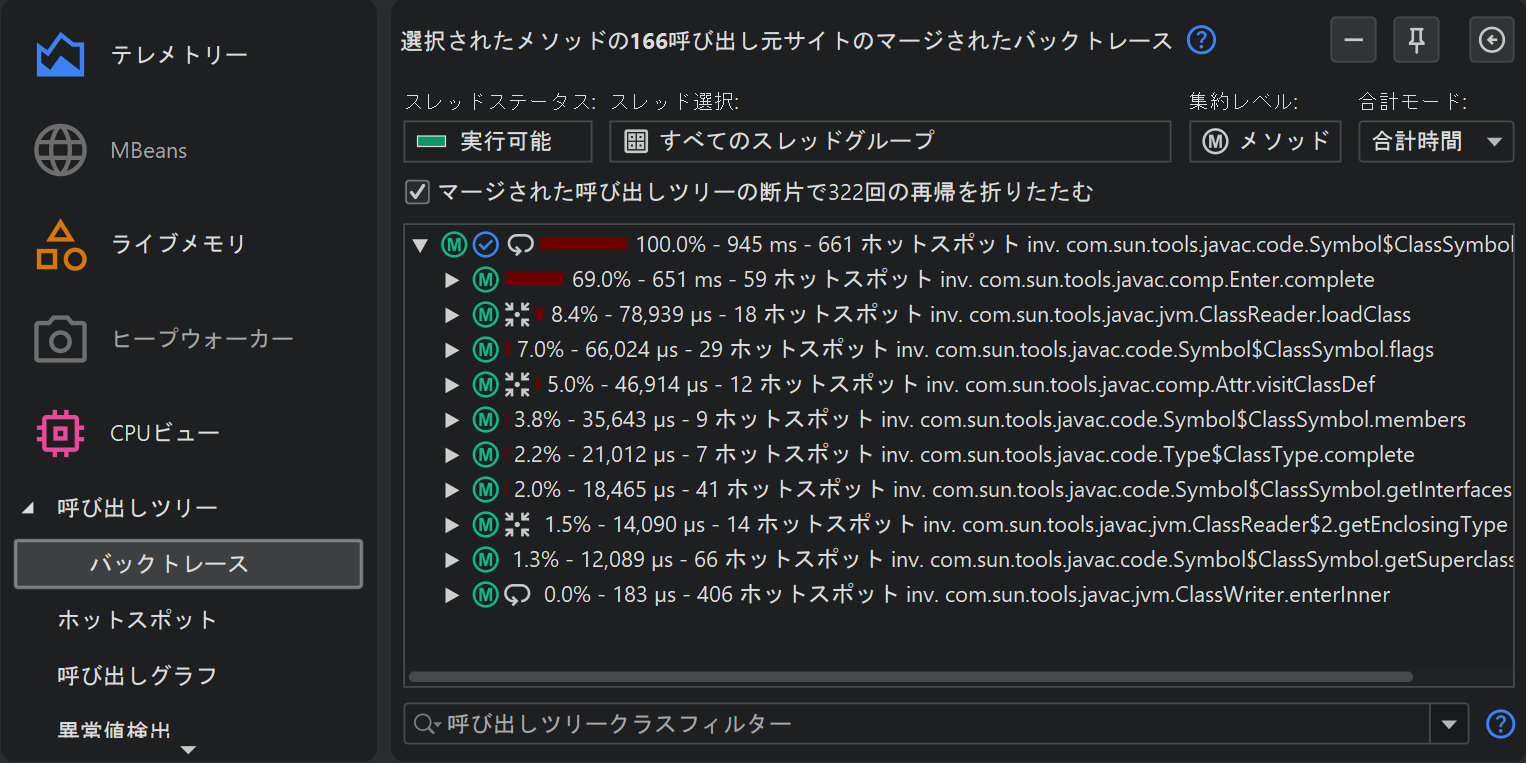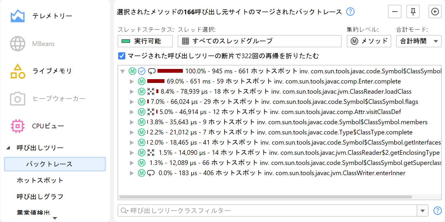 バックトレースでは、バックトレースノード上の呼び出し回数と時間は選択したメソッドにのみ関連します。それらは、その特定の呼び出しスタックが選択したメソッドの値にどれだけ寄与したかを示します。「累積アウトゴーイングコールの計算」解析と同様に、再帰を折りたたむことができ、バックトレースの最初のレベルはメソッド呼び出しグラフのインカミングコールと同等です。