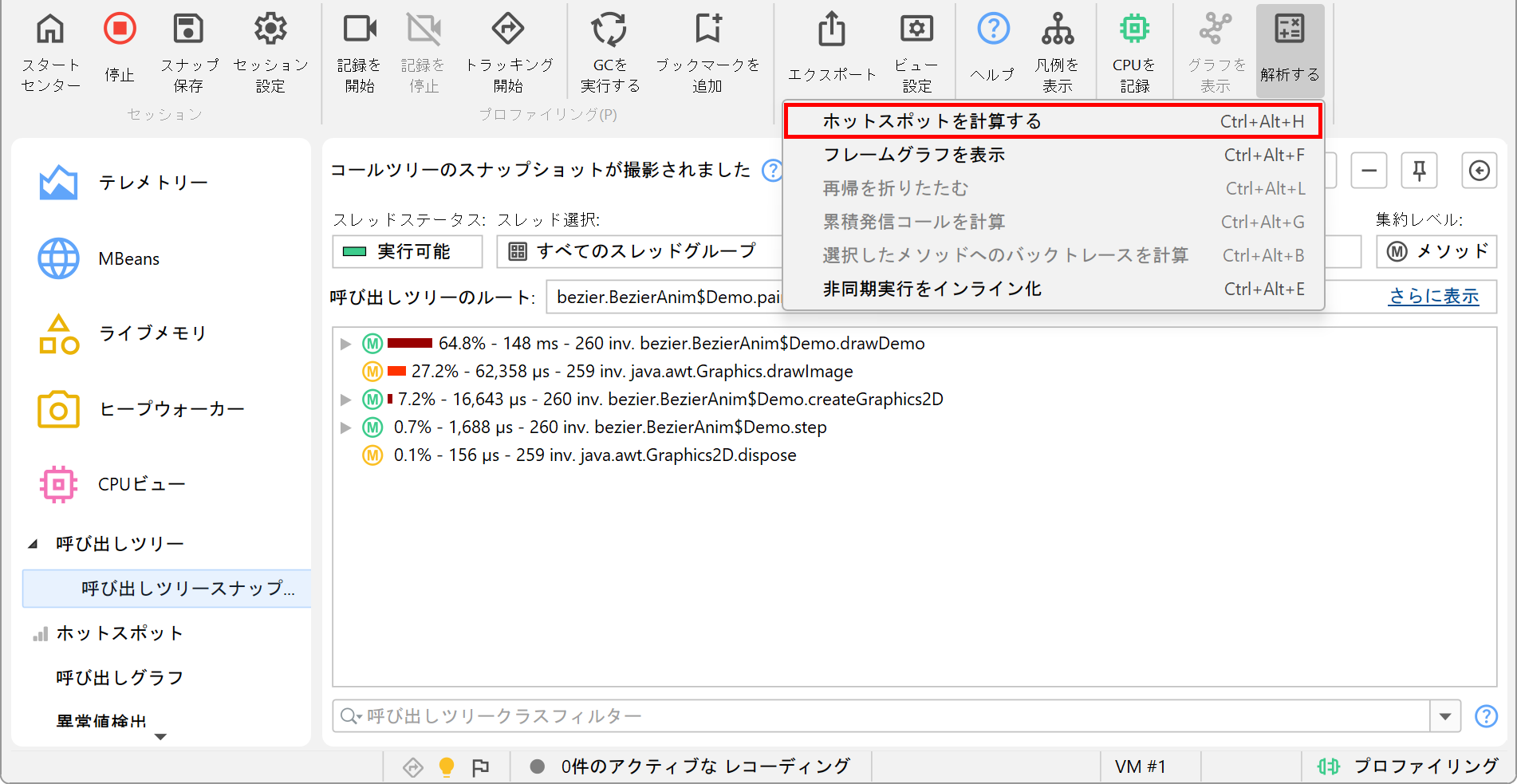 呼び出しツリービューで利用できる呼び出しツリー解析に加えて、呼び出しツリースナップショットには親ビューのホットスポットを計算する「ホットスポットの計算」アクションもあります(「CPUビュー」セクションの「ホットスポット」ビューと同様)。呼び出しツリースナップショットビューの下にネストされたビューからアクセスできるすべての解析は、トップレベルの呼び出しツリービューではなく、親の呼び出しツリースナップショットのデータで動作します。