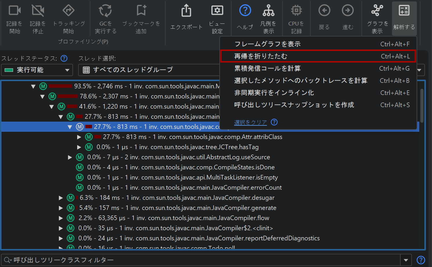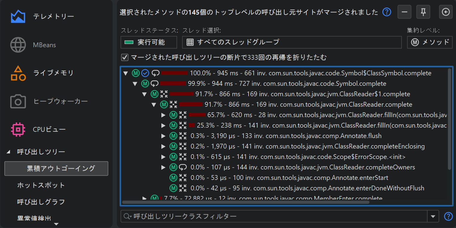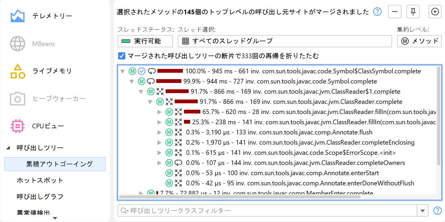 呼び出しツリーでは、選択したメソッドのアウトゴーイングコールを確認できますが、それはそのメソッドが呼び出された特定の呼び出しスタックに限られます。同じ関心のあるメソッドが異なる呼び出しスタックで呼び出されている場合もあり、すべての呼び出しを累積した呼び出しツリーを解析することで、より良い統計情報を得られることが多いです。「累積アウトゴーイングコールの計算」解析は、選択したメソッドのすべてのアウトゴーイングコールを合計した呼び出しツリーを表示します(呼び出し方法に関係なく)。