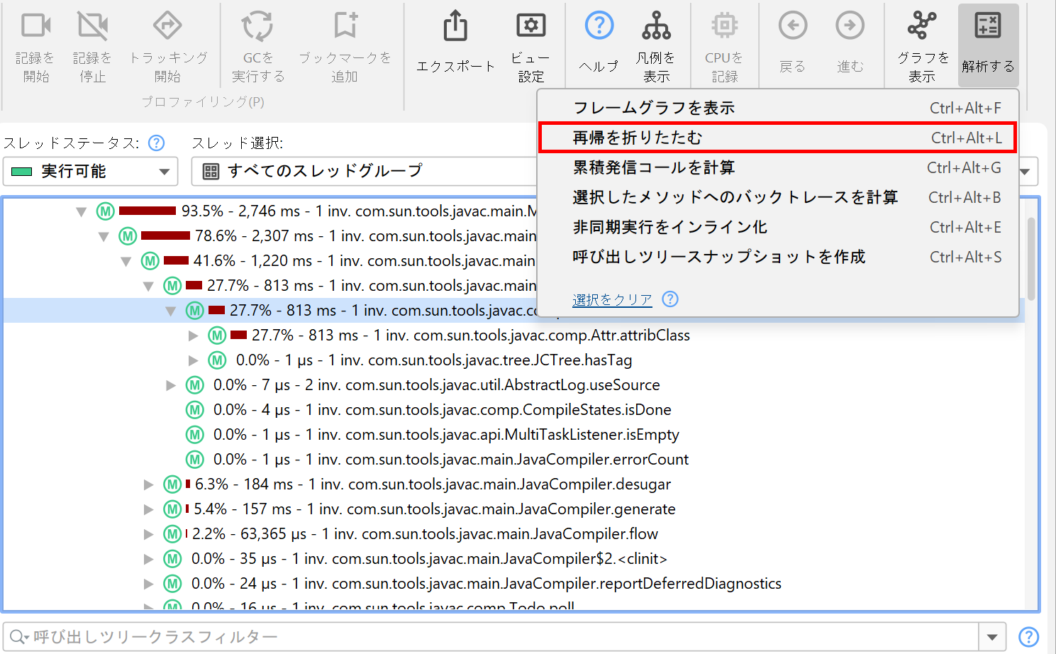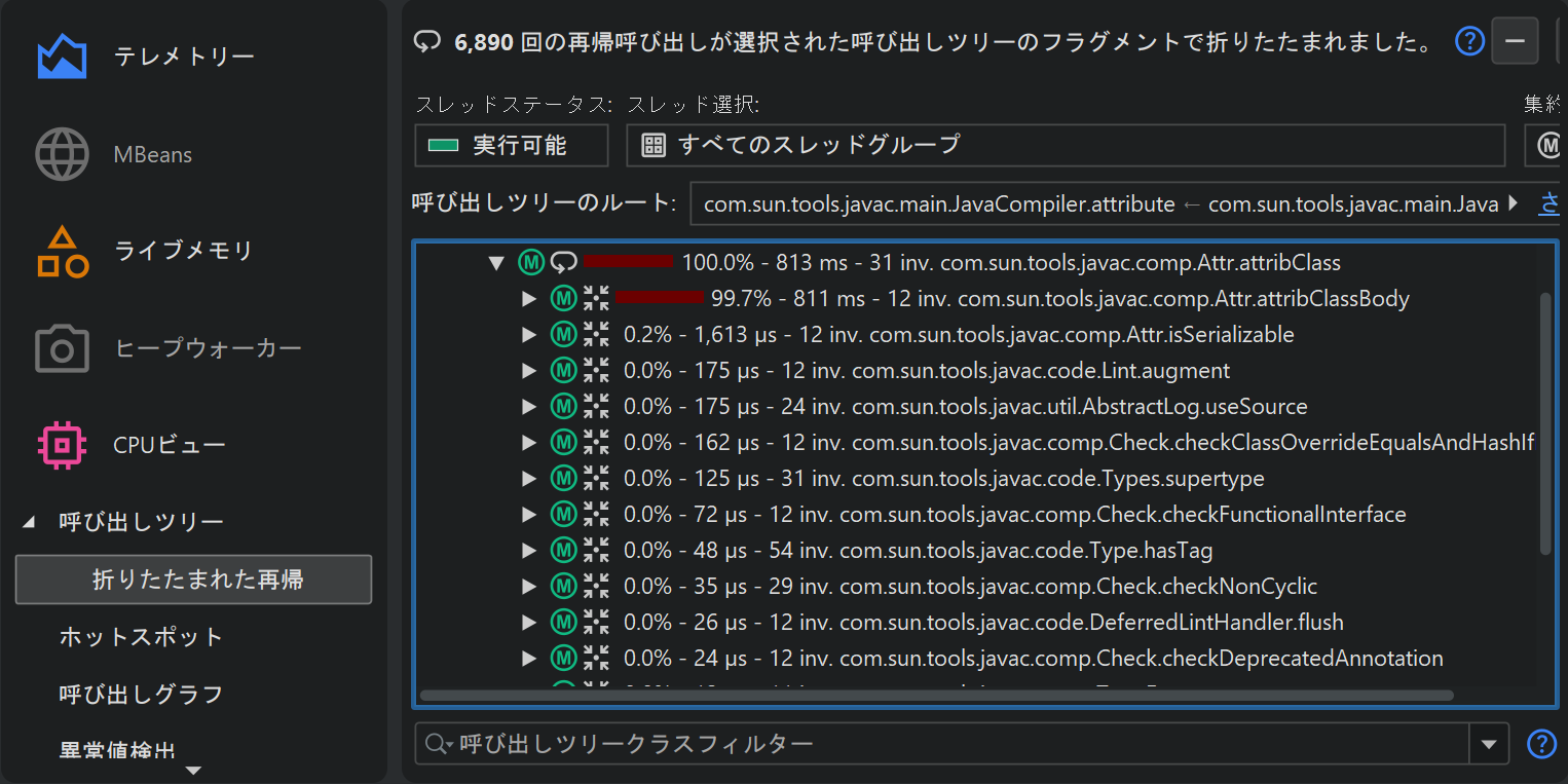 再帰を利用するプログラミングスタイルでは、解析が難しい呼び出しツリーが生成されます。「再帰の折りたたみ」呼び出しツリー解析は、すべての再帰を折りたたんだ呼び出しツリーを計算します。呼び出しツリーで現在選択されているノードの親ノードが、この解析のための呼び出しツリールートとなります。呼び出しツリー全体を解析するには、トップレベルノードのいずれかを選択してください。