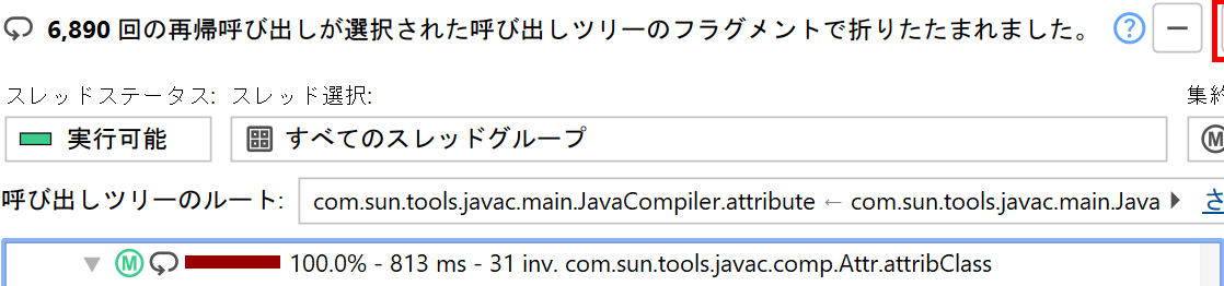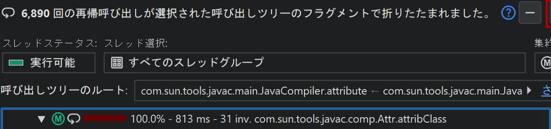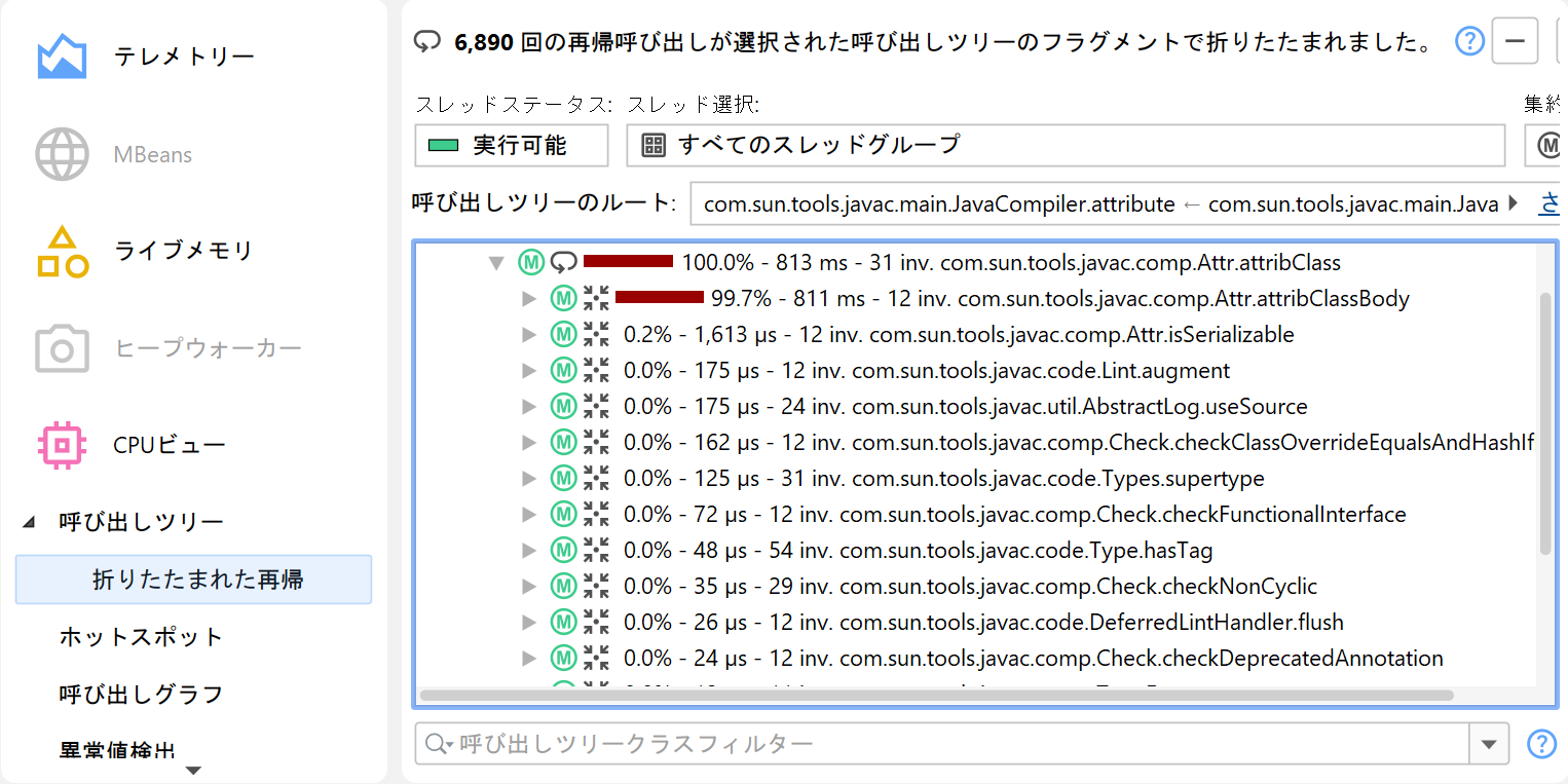 選択したメソッドについて、JProfilerは再帰呼び出しを考慮せず、すべてのトップレベル呼び出し元サイトを収集し、結果ツリーで累積します。ヘッダーには、その処理で合計されたトップレベル呼び出し元サイトの数が表示されます。