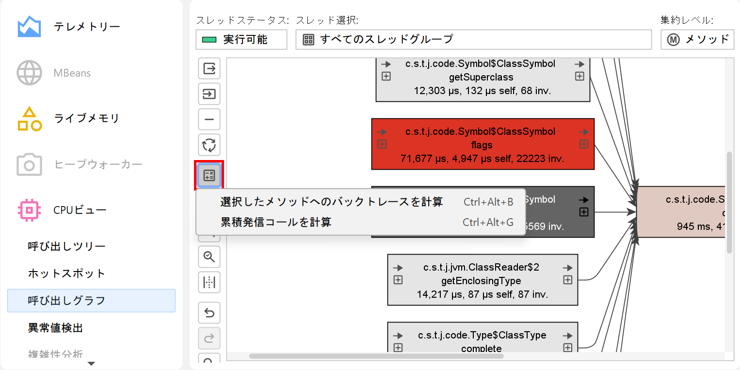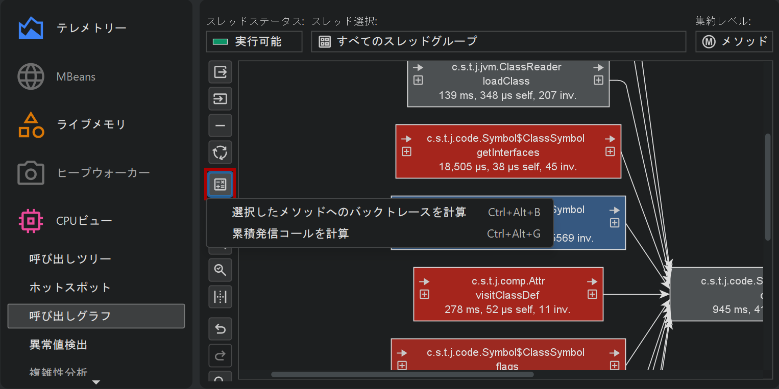 呼び出しグラフでは各メソッドが一意ですが、呼び出しツリーではメソッドが複数の呼び出しスタックに現れることがあります。選択した1つのメソッドについて、「累積アウトゴーイングコールの計算」と「バックトレースの計算」解析は、呼び出しツリーと呼び出しグラフの視点をつなぐ橋渡しとなります。これらは選択したメソッドを中心に、アウトゴーイングコールとインカミングコールをツリーとして表示します。呼び出しグラフを表示アクションを使えば、いつでも完全なグラフに切り替えられます。