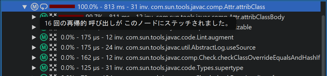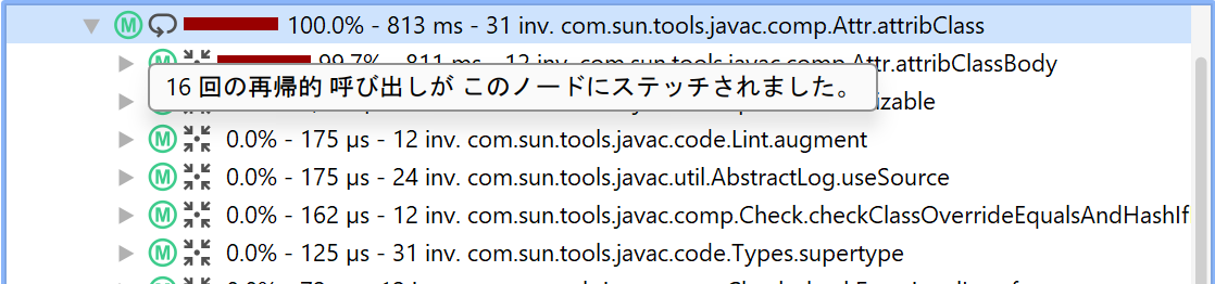 同じメソッドが呼び出しスタックの上位で既に呼び出されている場合、再帰と判定されます。その場合、サブツリーは呼び出しツリーから削除され、最初にそのメソッドが呼び出された箇所に再接続されます。そのノードには、再帰回数を示すツールチップ付きのアイコンがプレフィックスとして表示されます。そのノードの下では、異なる深さからのスタックがマージされます。マージされたスタック数もツールチップで表示されます。折りたたまれた再帰の合計数は、元の呼び出しツリーのパラメータ情報の上にあるヘッダーに表示されます。