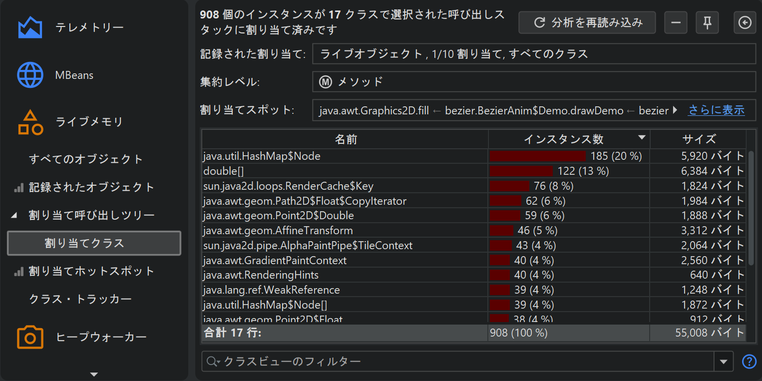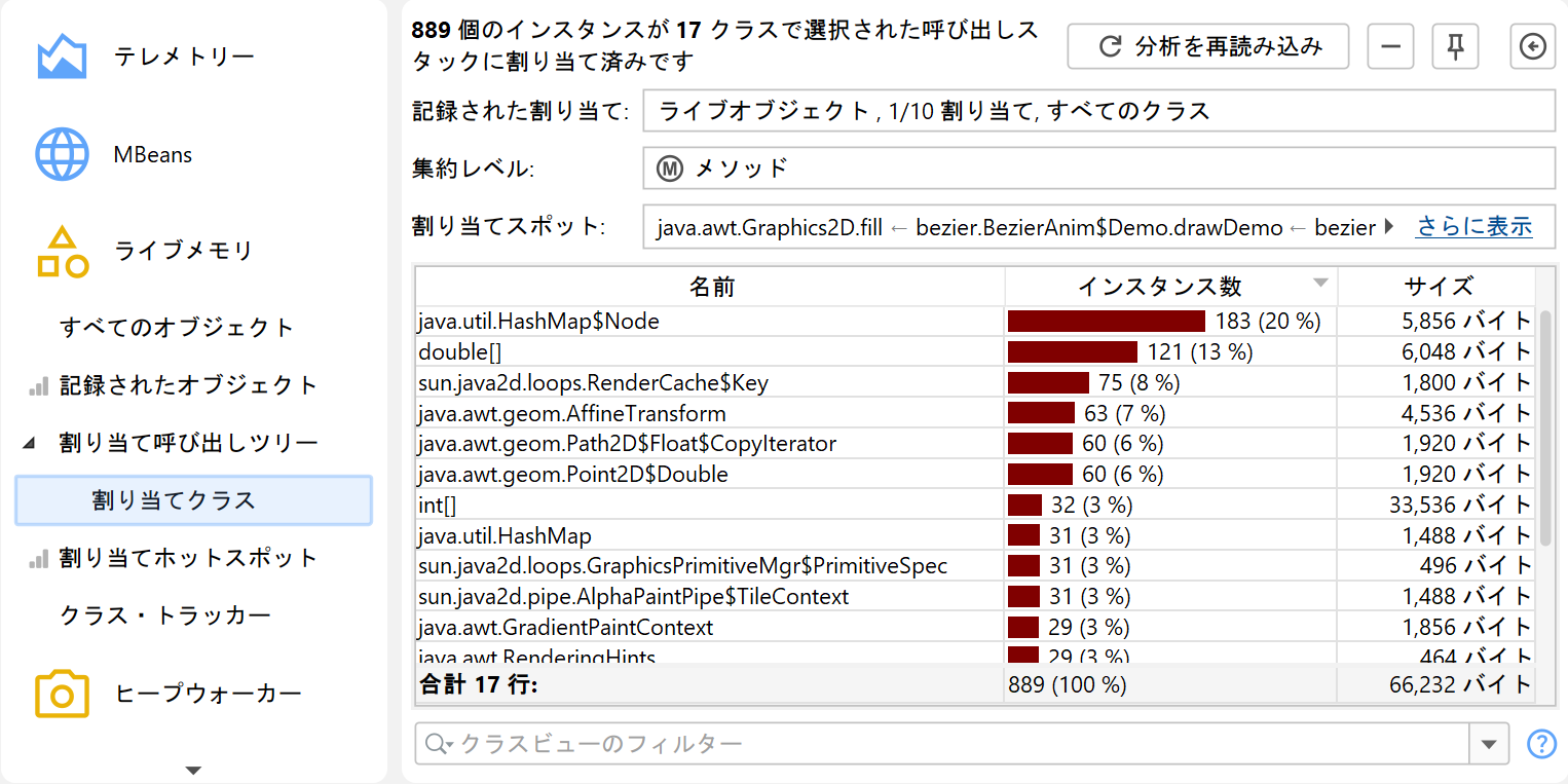 これまでの呼び出しツリー解析とは少し異なり、割り当て呼び出しツリーおよび割り当てホットスポットビューで利用できる「クラスの表示」解析があります。これは呼び出しツリーを別のツリーに変換するのではなく、すべての割り当て済みクラスを一覧表示するテーブルを表示します。結果ビューは記録済みオブジェクトビューに似ていますが、特定の割り当てスポットに限定されています。