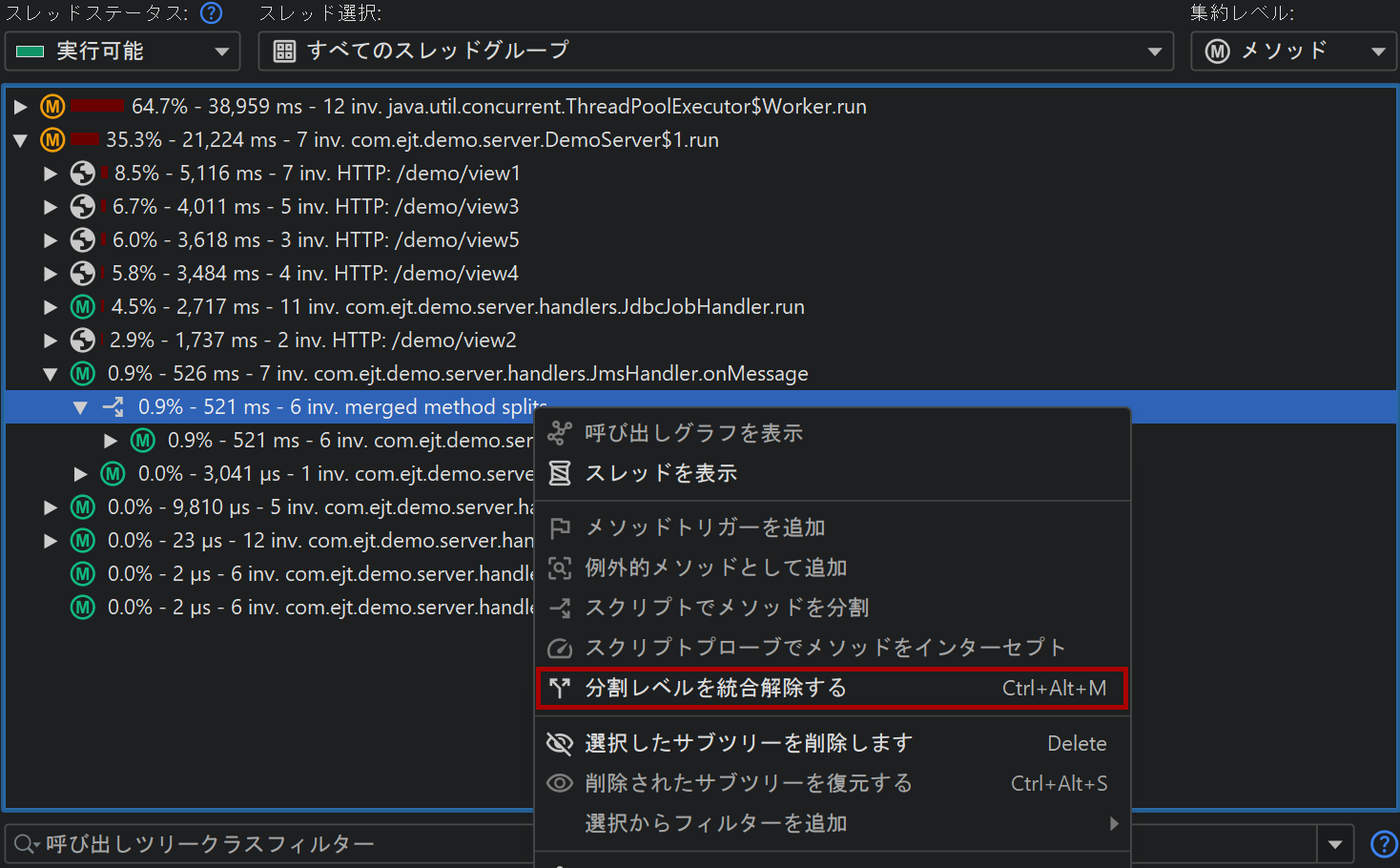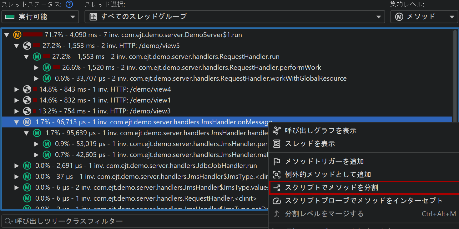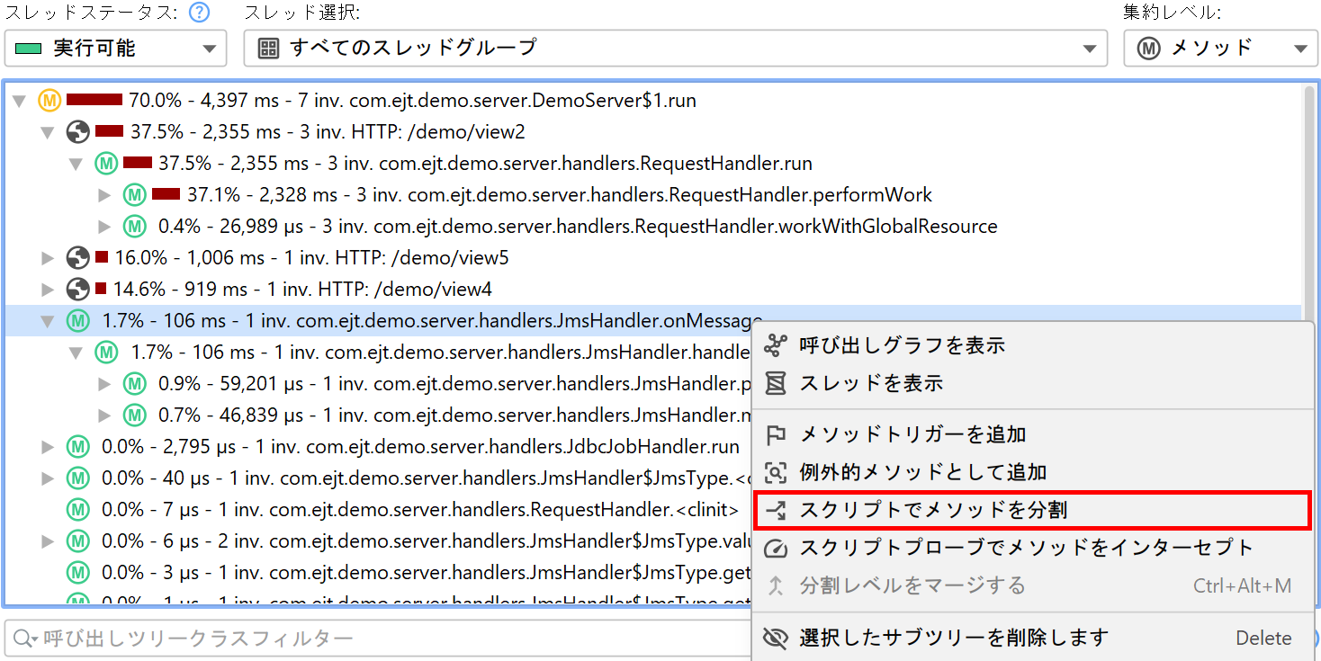 プローブで利用可能な同じ分割機能を、スクリプトでメソッドを分割アクションを使用して、直接呼び出しツリーで使用できます。以下のスクリーンショットでは、JMSメッセージハンドラの呼び出しツリーを分割して、異なるタイプのメッセージの処理を個別に確認したいと考えています。