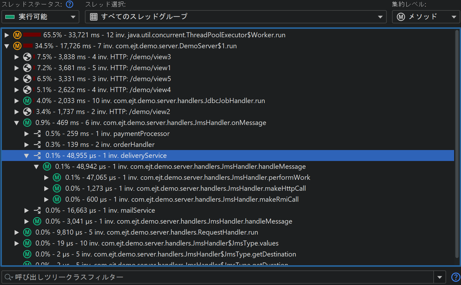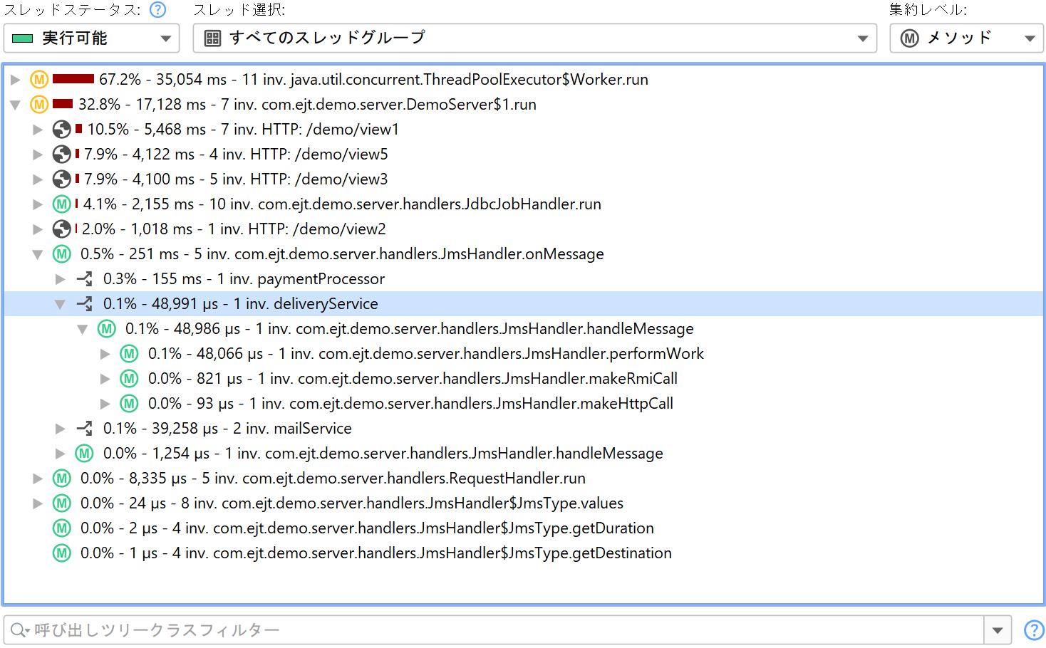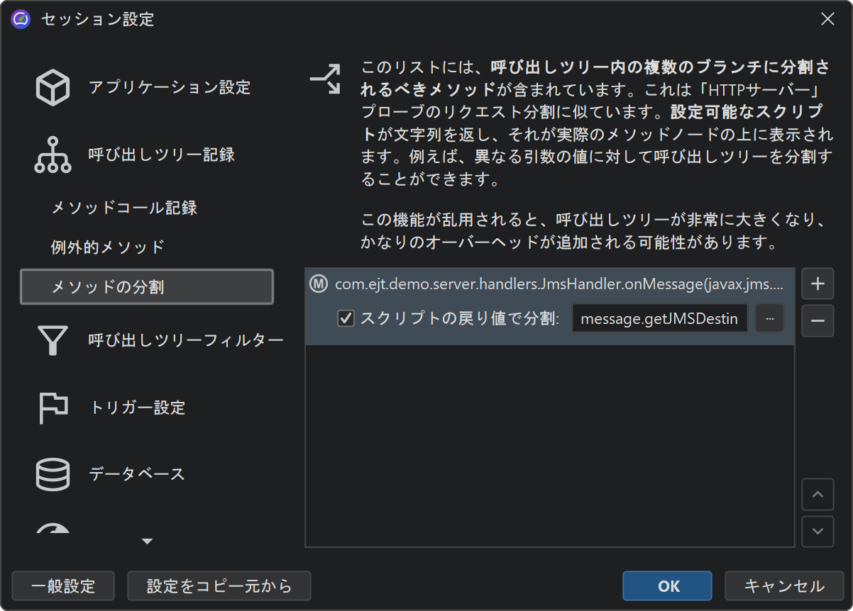 プローブで利用可能な同じ分割機能を、スクリプトでメソッドを分割アクションを使用して、直接呼び出しツリーで使用できます。以下のスクリーンショットでは、JMSメッセージハンドラの呼び出しツリーを分割して、異なるタイプのメッセージの処理を個別に確認したいと考えています。