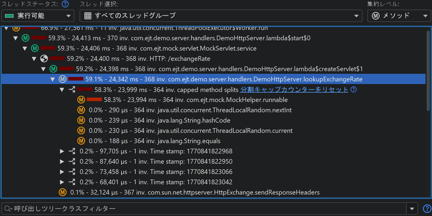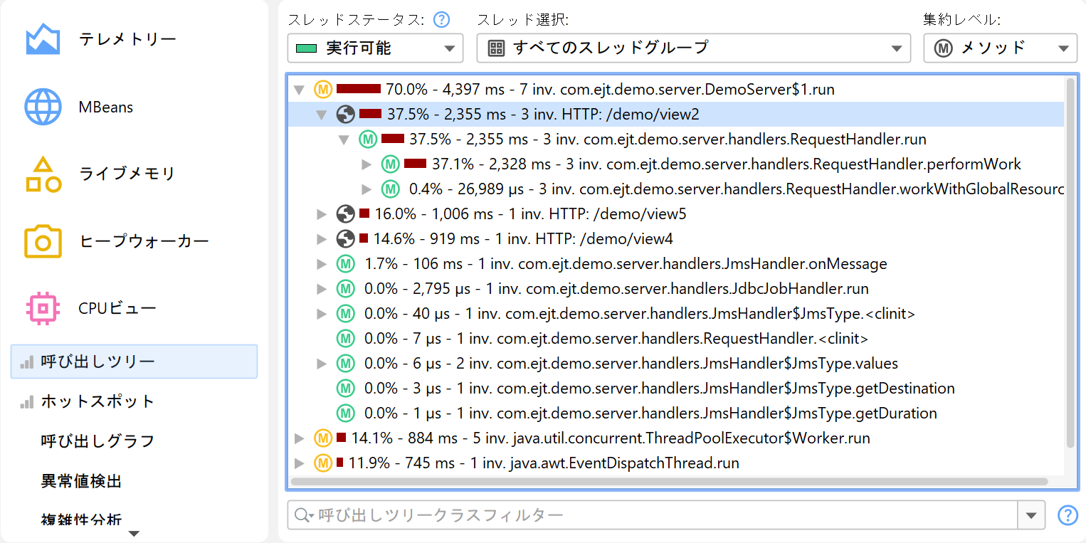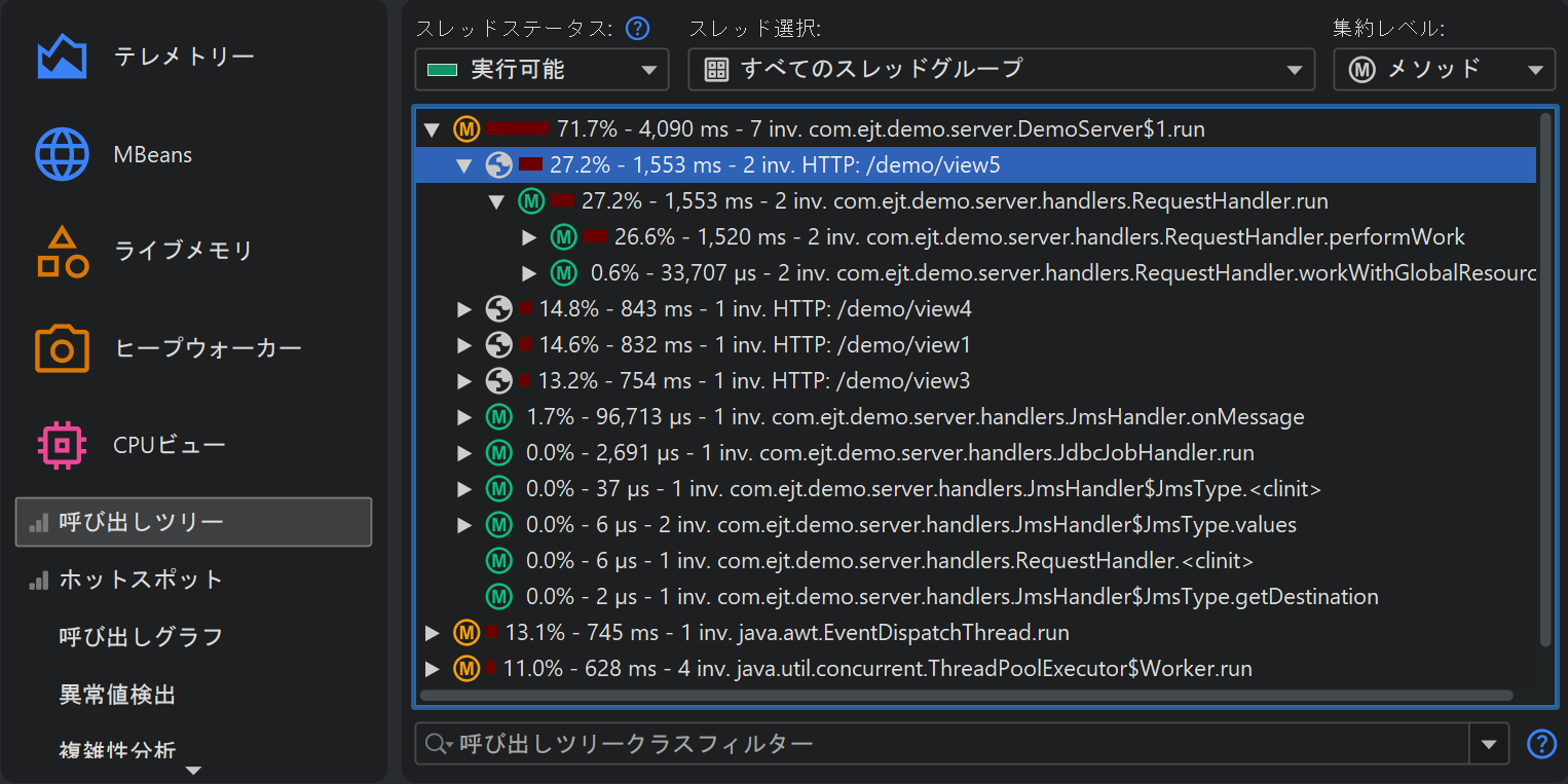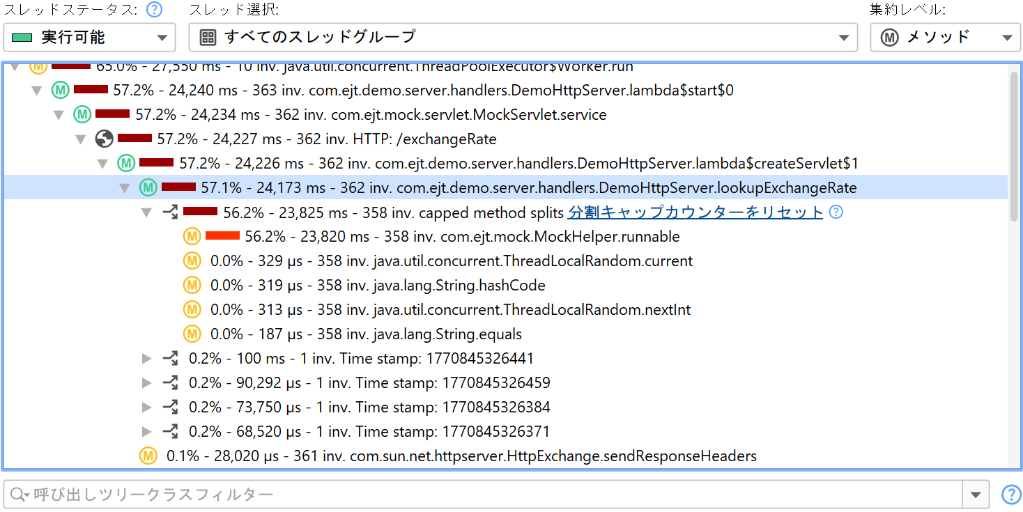 JProfilerには、呼び出しスタックに特別なノードを挿入し、挿入されたノードの上にあるメソッド呼び出しから抽出されたセマンティック情報を表示することで、呼び出しツリーを分割するという概念があります。これらの分割ノードにより、呼び出しツリー内で追加のペイロード情報を直接確認し、それらのサブツリーを個別に分析することができます。各分割タイプは、コンテキストメニューのアクションで動的にマージおよびアンマージでき、メモリのオーバーヘッドが制限されるように分割ノードの総数に上限があります。