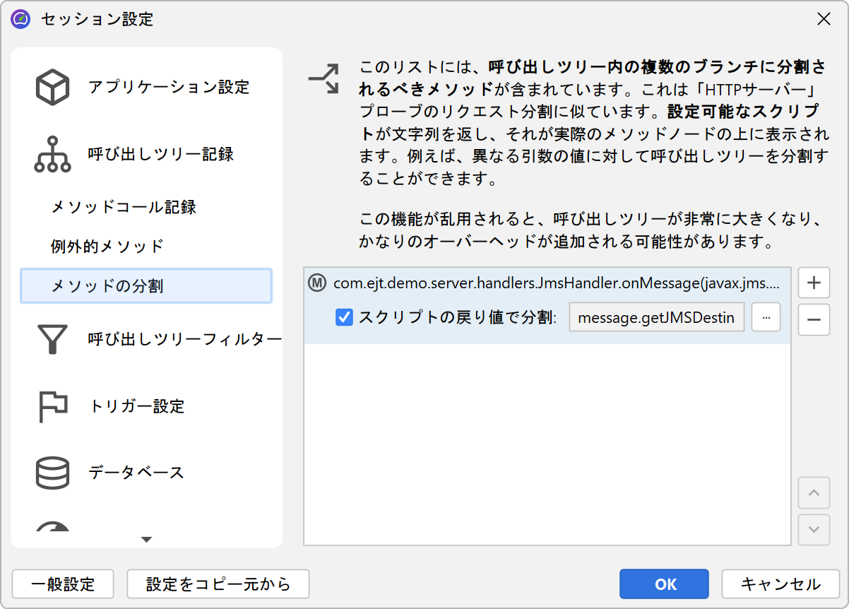 作成後に分割メソッドを編集するには、セッション設定ダイアログに移動します。特定の分割メソッドがもう必要ないが、将来の使用のために保持したい場合、スクリプト設定の前のチェックボックスを使用して無効にできます。これは、呼び出しツリーで単にマージするよりも優れています。なぜなら、記録のオーバーヘッドが重要である可能性があるからです。