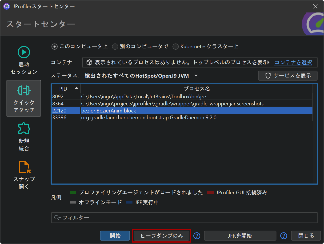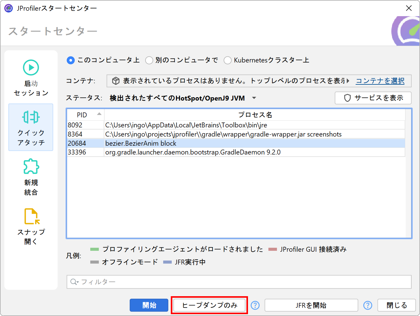プロファイリングエージェントをロードせずにHPROFヒープスナップショットを撮ることは、JProfiler GUIでもサポートされています。 プロセスにアタッチする際、ローカルでもリモートでも、常にHPROFヒープスナップショットを撮ることができます。