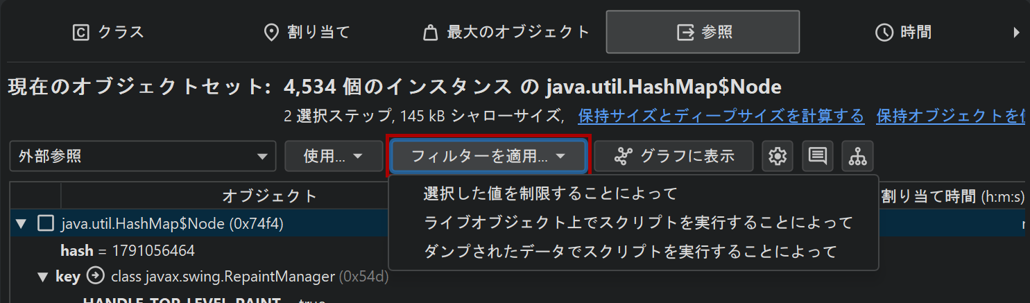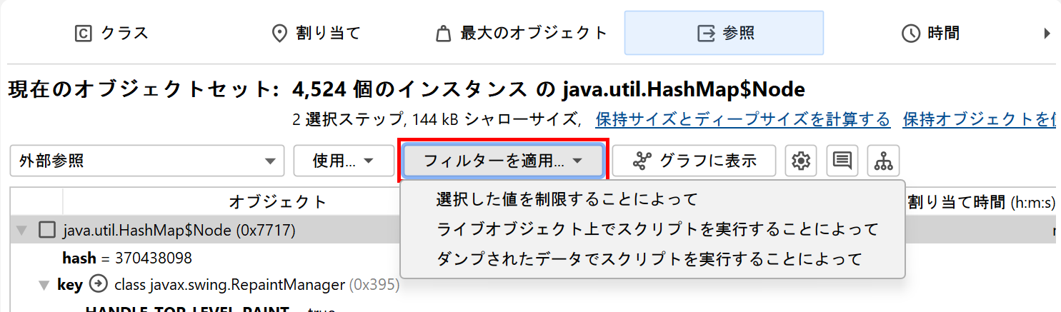HPROFやPDHスナップショットを含むスナップショットでも機能するもう一つのオプションは、ダンプされたデータでスクリプトを実行してフィルターを適用アクションです。各インスタンスは、com.jprofiler.api.agent.heap.HeapObjectのインスタンスとしてスクリプトに渡されます。適用可能な場合、パラメータをダウンキャストできるいくつかのサブインターフェースがあります。詳細については、Javadocを参照してください。例えば、オブジェクトがオブジェクトインスタンスであり、フィールド値へのアクセスを提供する場合、com.jprofiler.api.agent.heap.Instanceインターフェースが利用可能です。スクリプトがトップレベルのオブジェクトで動作し、現在のオブジェクトセットのすべてのオブジェクトが同じタイプである場合、スクリプトパラメータは自動的に適切なサブタイプを持ちます。