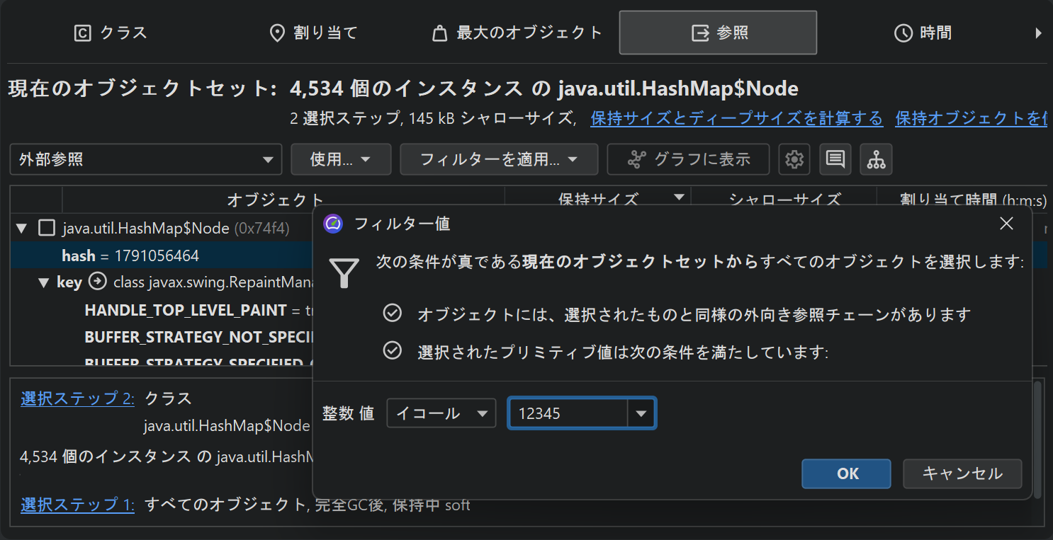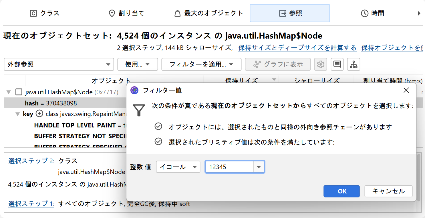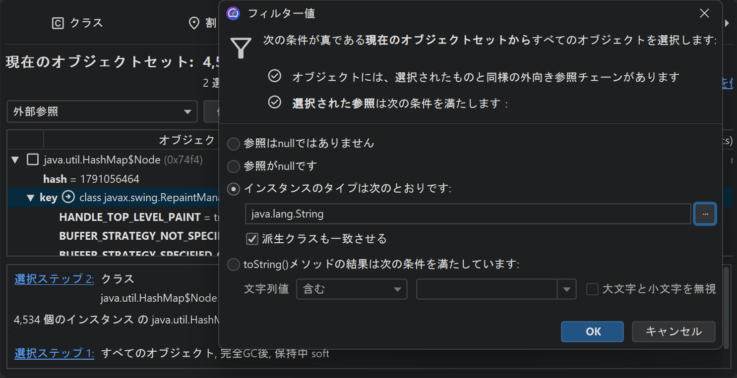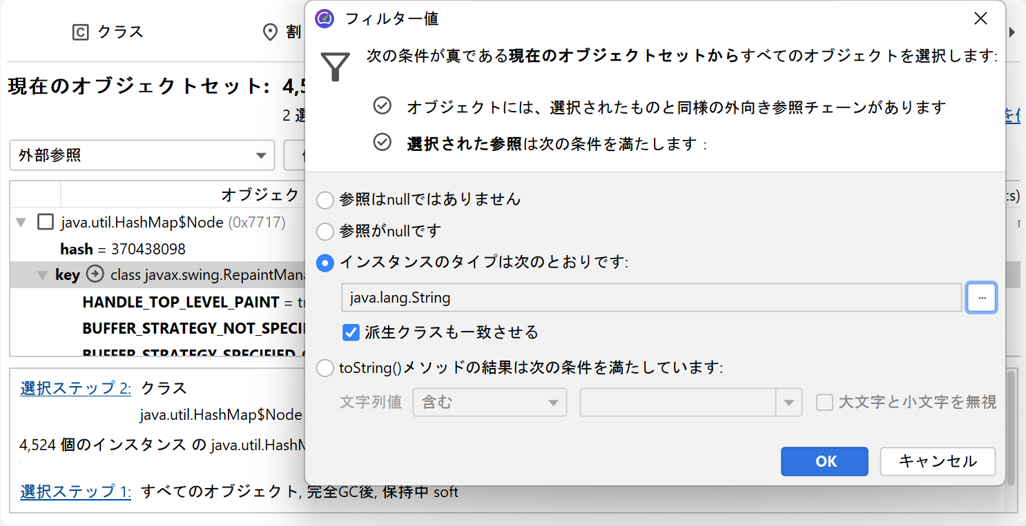 プリミティブ値の制約は、HPROFおよびJProfilerヒープスナップショットの両方で機能します。参照型の場合、JProfilerに非null値、null値、および選択したクラスの値をフィルタリングするように依頼できます。toString()メソッドの結果によるフィルタリングは、ライブセッションでのみ利用可能ですが、java.lang.Stringおよびjava.lang.Classオブジェクトの場合、JProfilerはこれを自動的に判断できます。