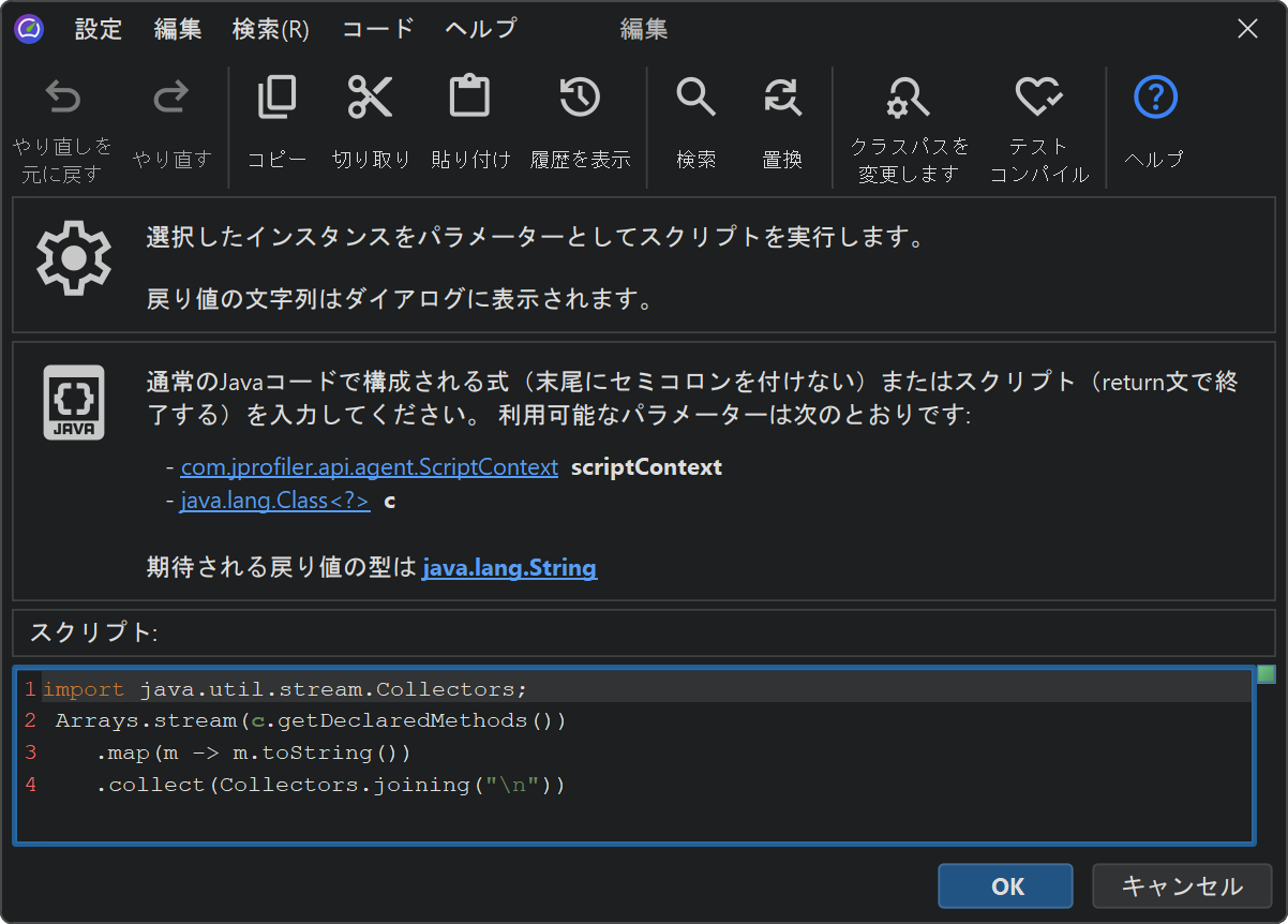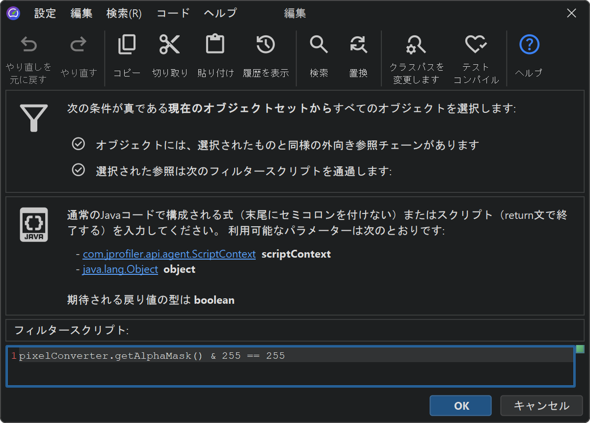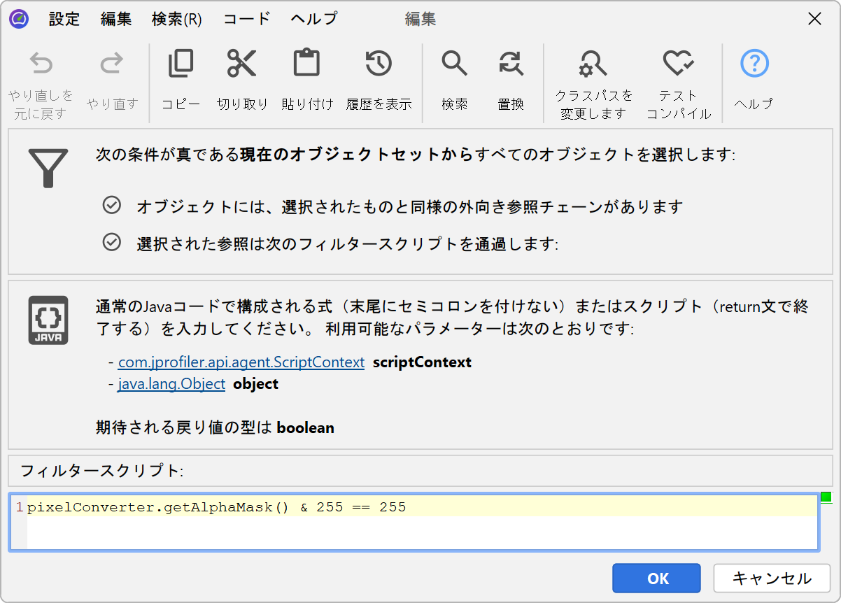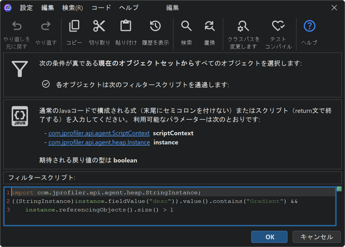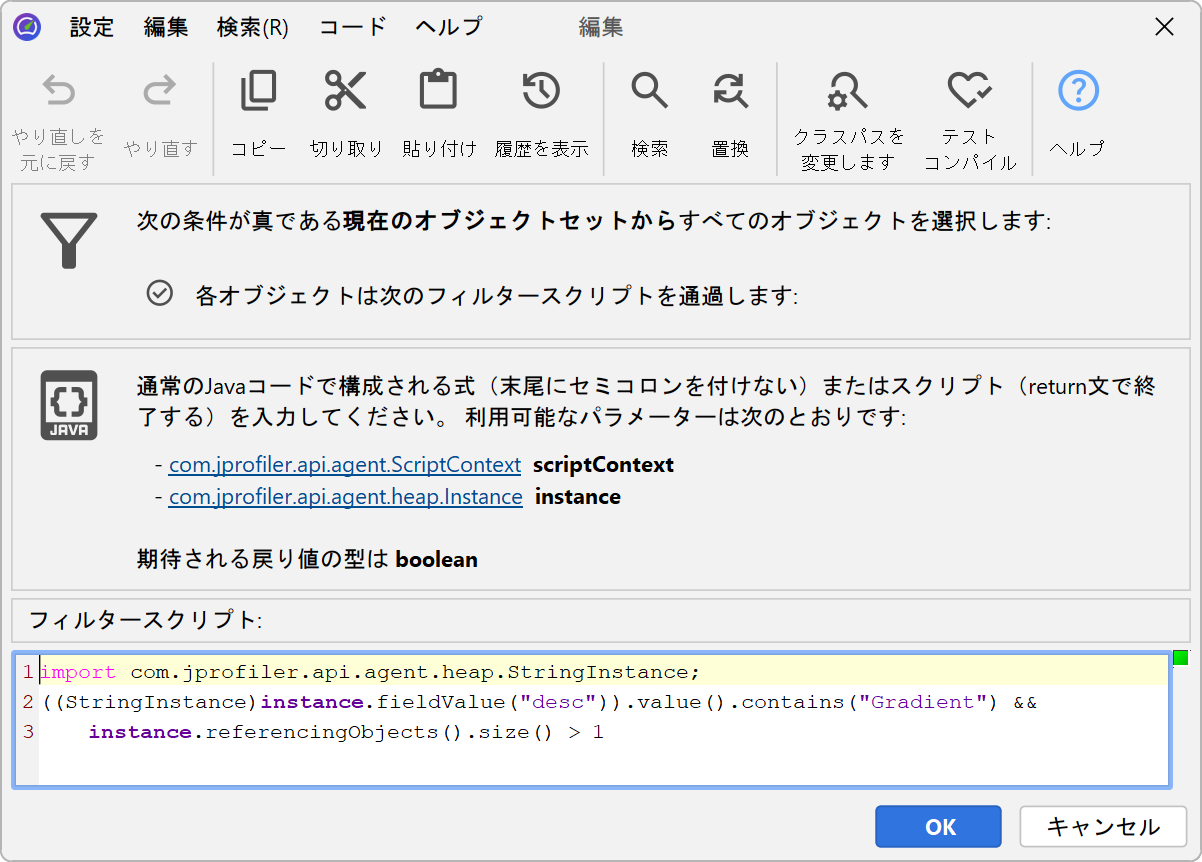 ライブセッションでは、JProfilerはプロファイルされたJVMでフィルタリングスクリプトを実行し、実際のインスタンスをスクリプトに渡すことができます。ライブオブジェクトでスクリプトを実行してフィルターを適用によって表示されるスクリプトエディタでは、プロパティに直接アクセスする式やスクリプトを書き、そのブール値の戻り値がインスタンスが現在のオブジェクトセットに保持されるべきかどうかを決定します。