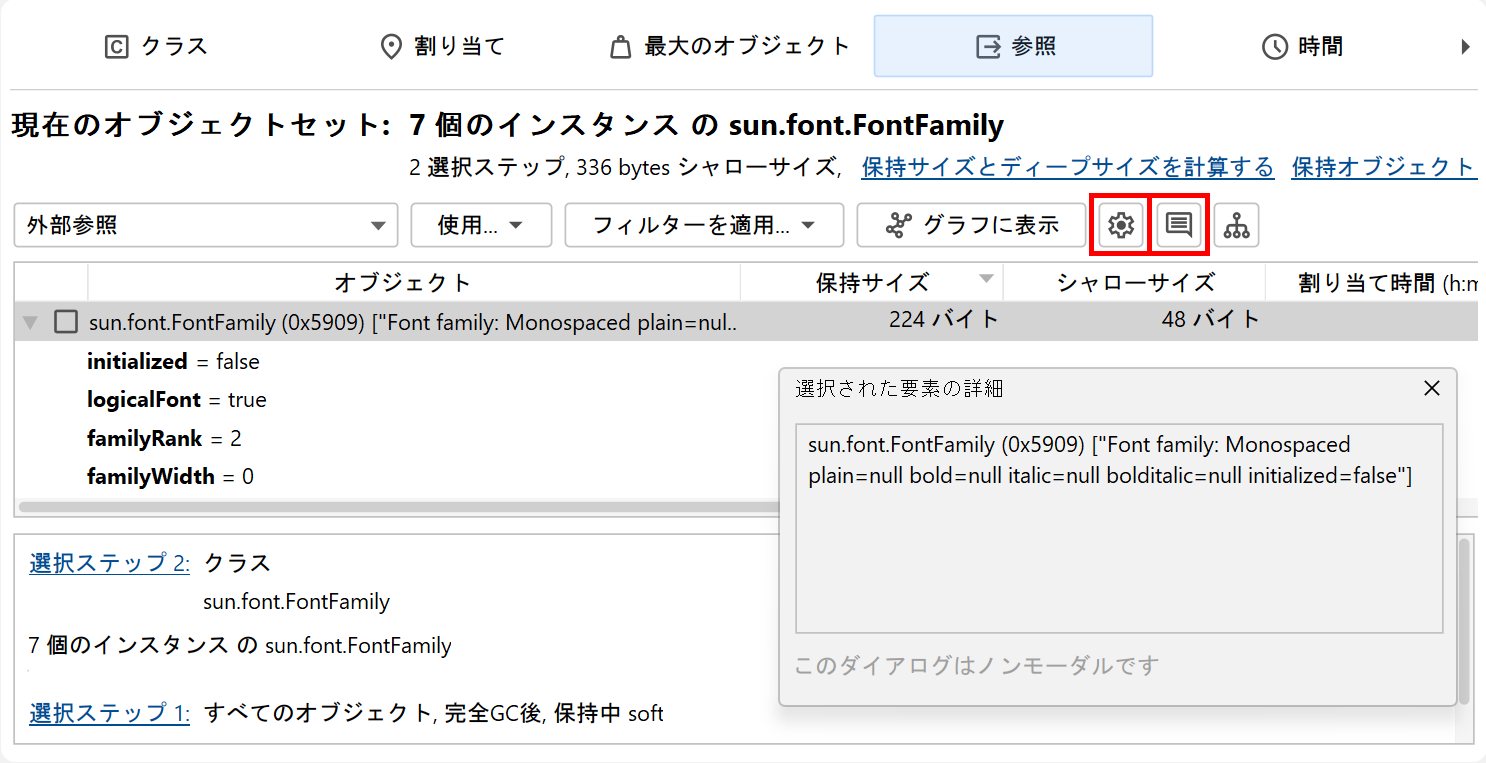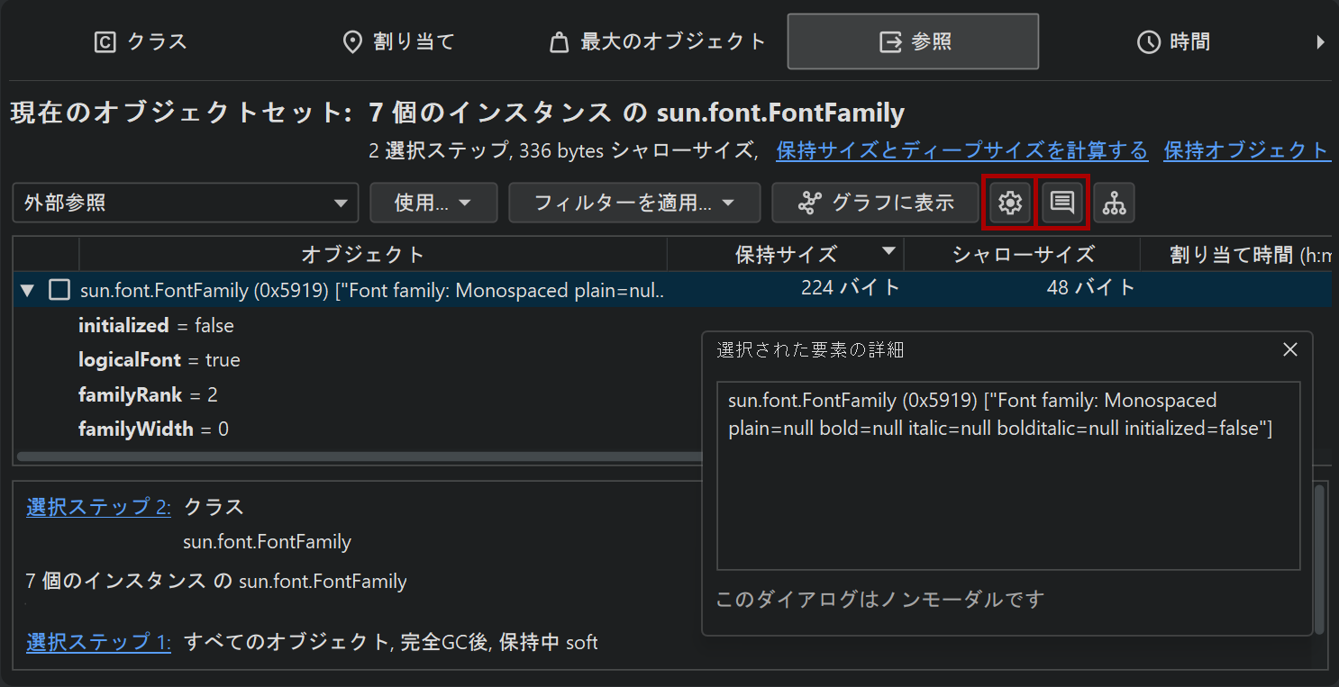 フィルター以外にも、個々のオブジェクトと対話するためのアウトゴーイング参照ビューには2つの他の機能があります:toString()値を表示アクションは、現在ビューに表示されているすべてのオブジェクトでtoString()メソッドを呼び出し、それらを参照ノードに直接表示します。ノードは非常に長くなる可能性があり、テキストが切り取られることがあります。コンテキストメニューからノードの詳細を表示アクションを使用すると、全体のテキストを確認できます。