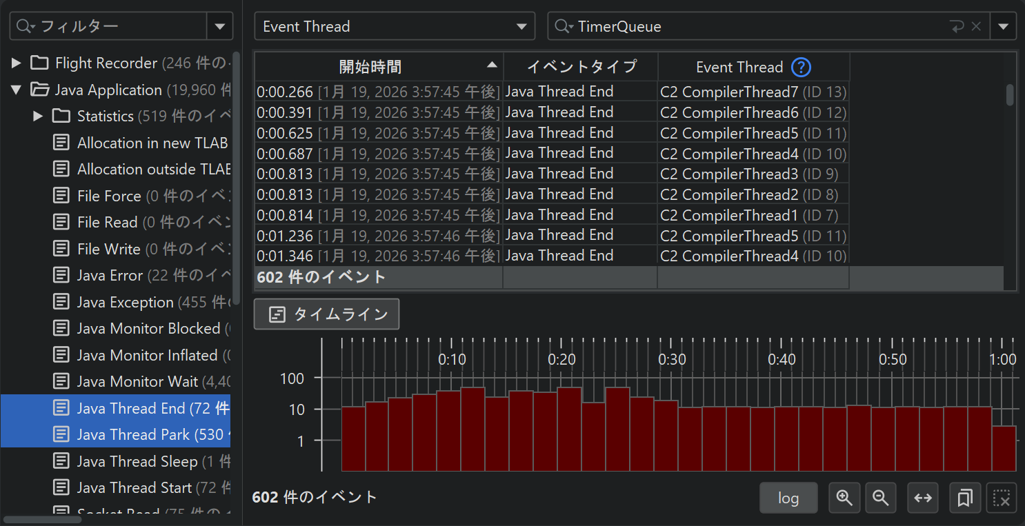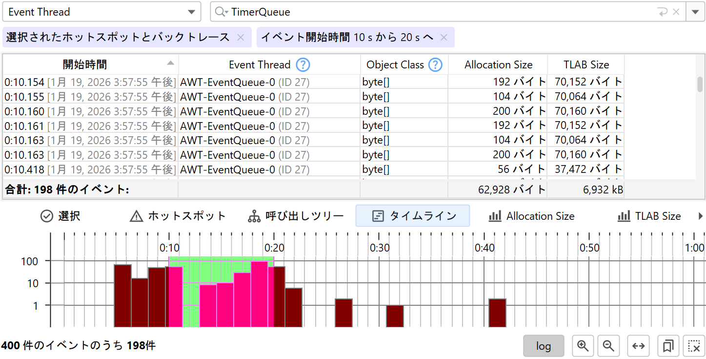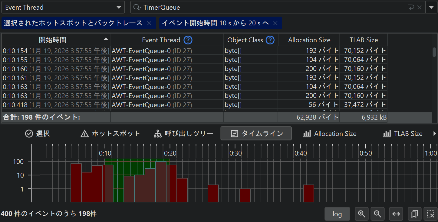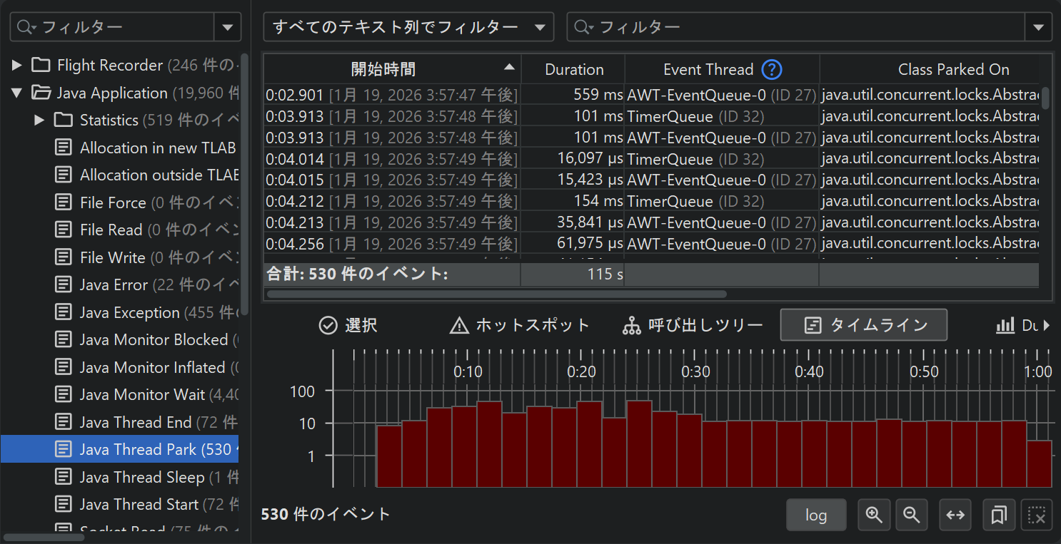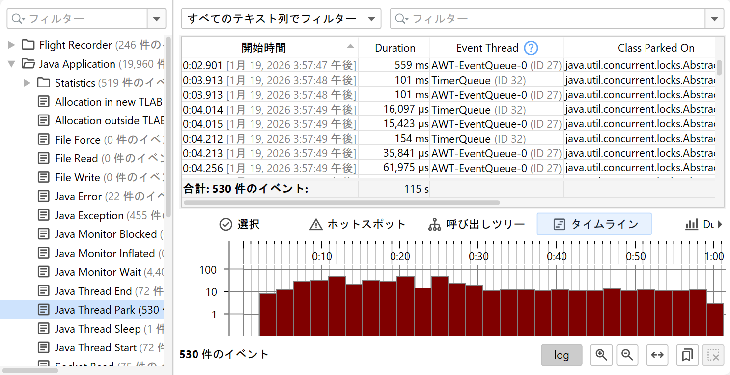 すべての JFR イベントには関連する時間があるため、すべてのイベントタイプまたはイベントタイプのセットには、イベントの時間的な分布を示すタイムラインビューがあります。