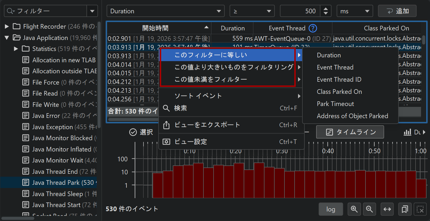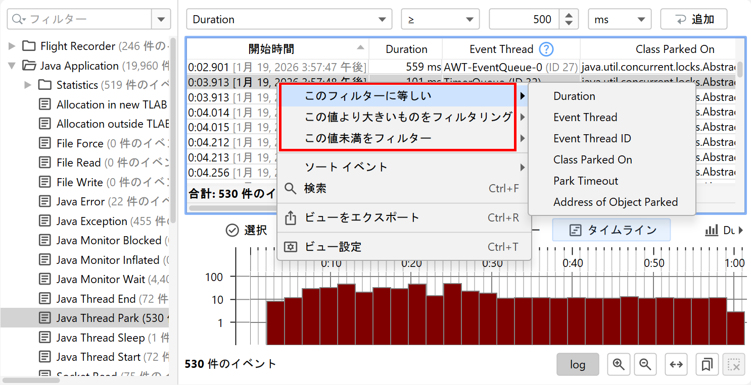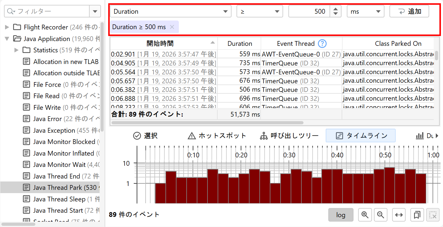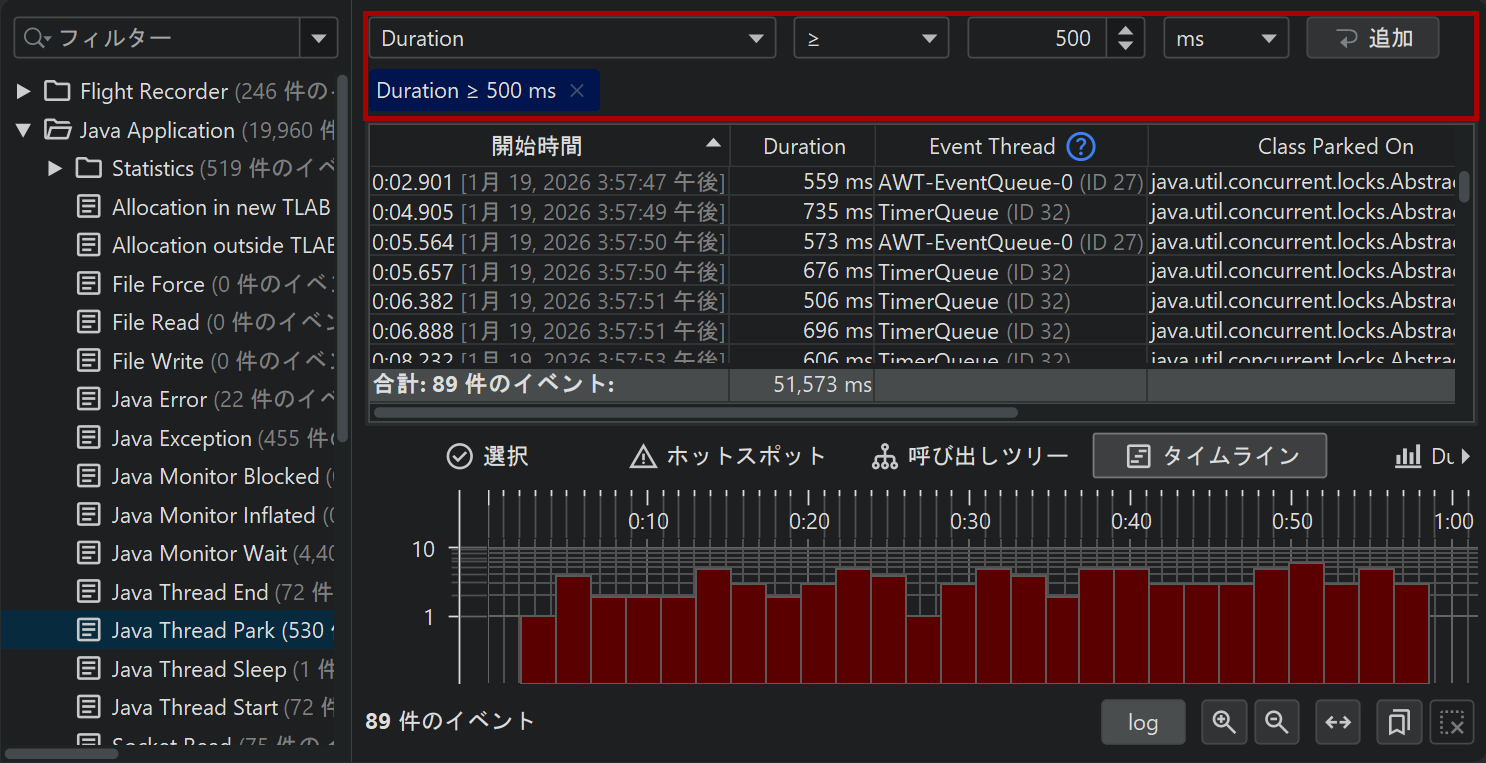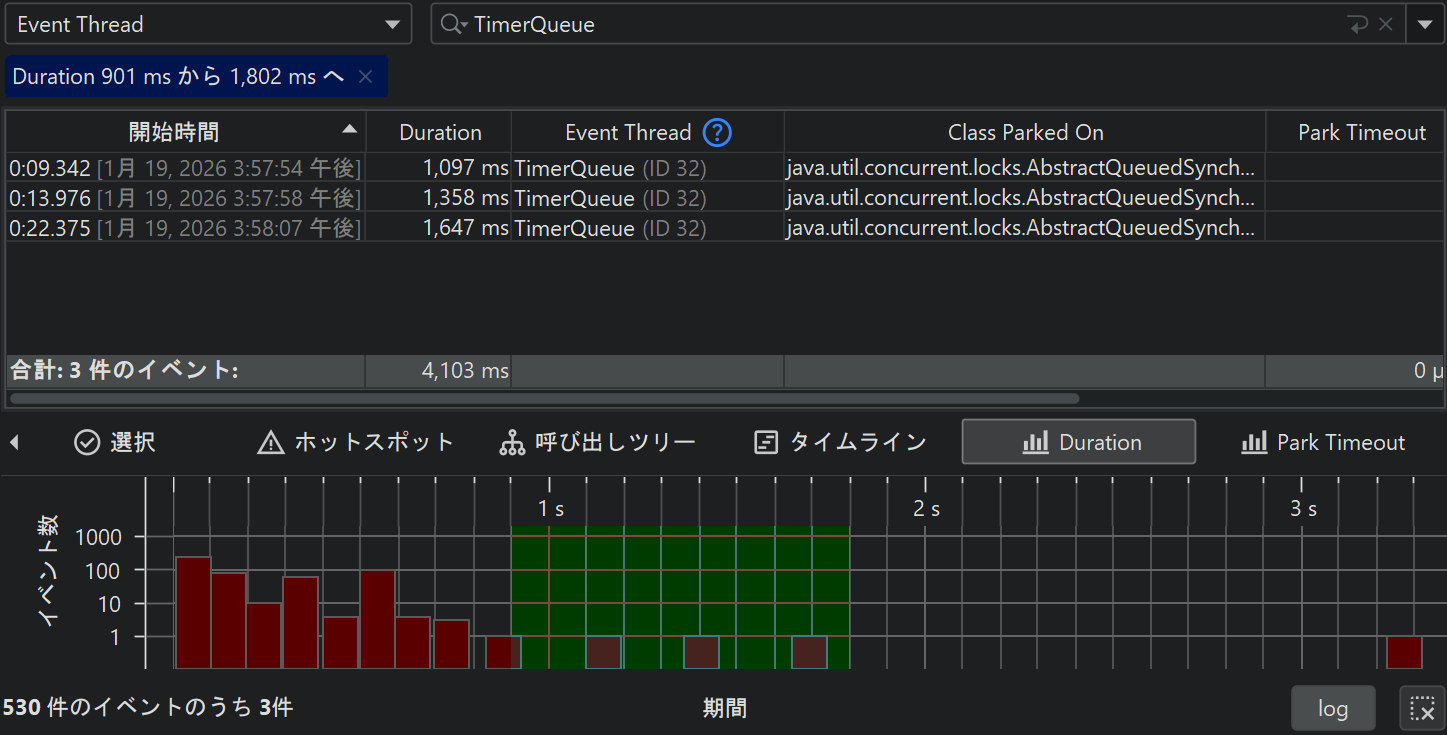 すべての JFR イベントには関連する時間があるため、すべてのイベントタイプまたはイベントタイプのセットには、イベントの時間的な分布を示すタイムラインビューがあります。