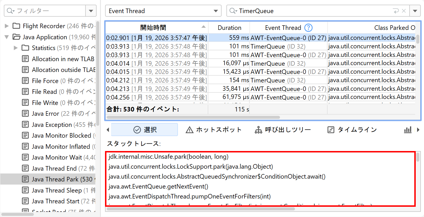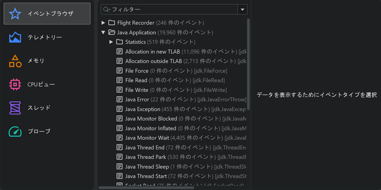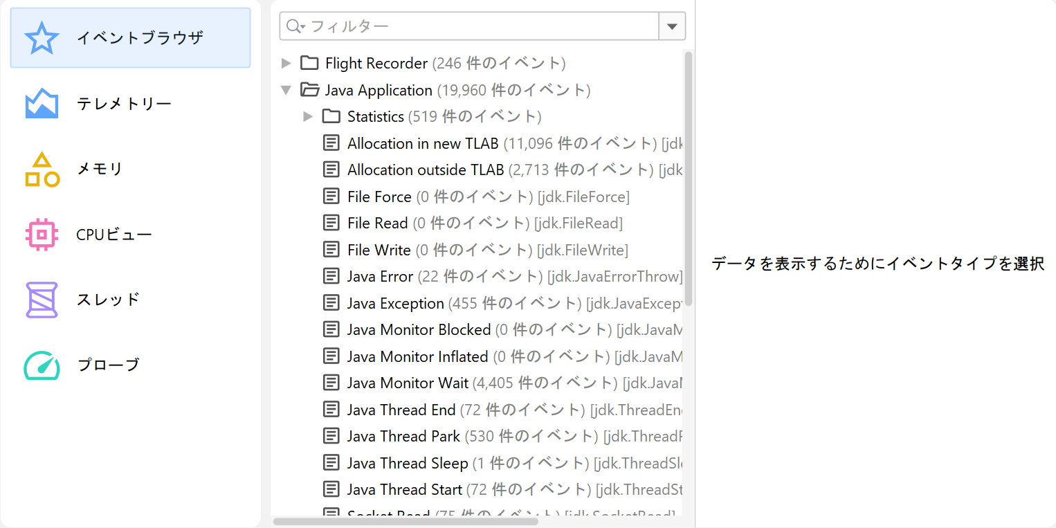 イベントブラウザは、JFR スナップショットに記録されたすべてのデータを表示します。