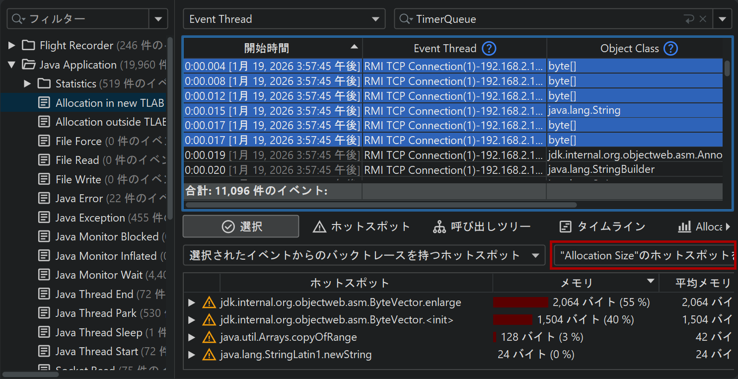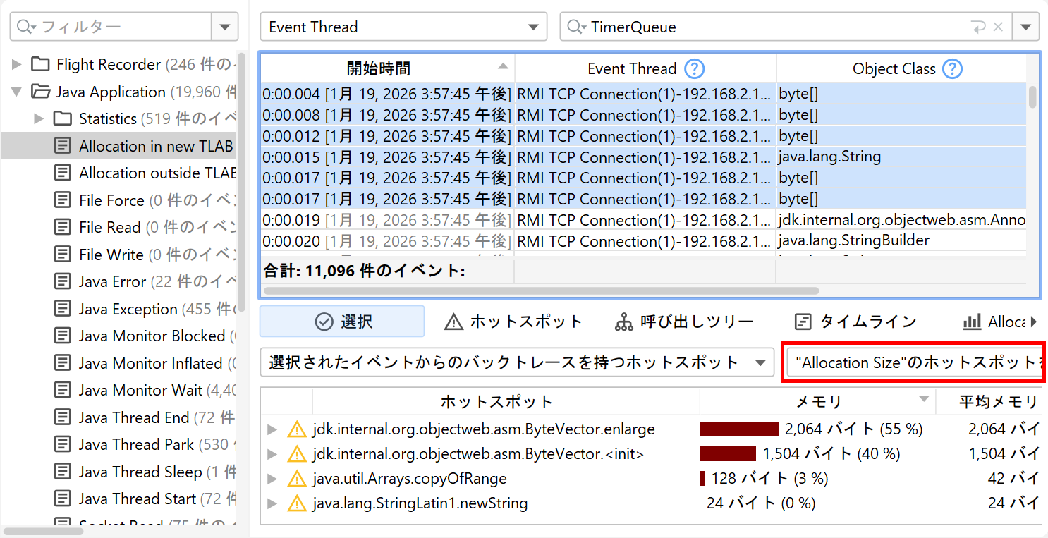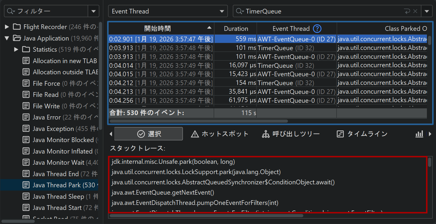 イベントブラウザは、JFR スナップショットに記録されたすべてのデータを表示します。