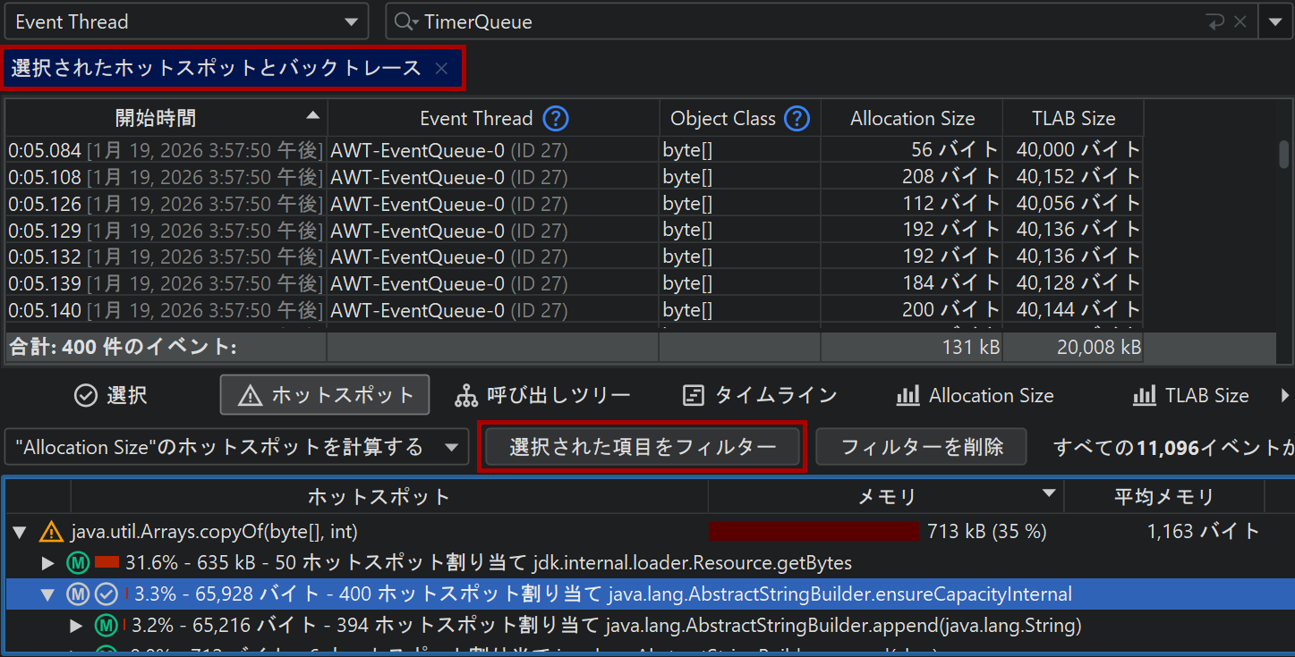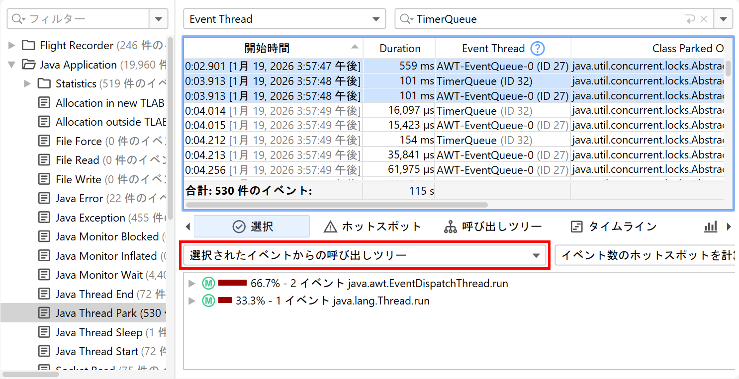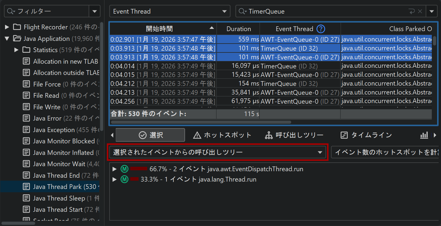 複数のイベントを選択すると、選択タブが変更され、選択されたイベントのスタックトレースから計算されたホットスポットまたは累積呼び出しツリーが表示されます。