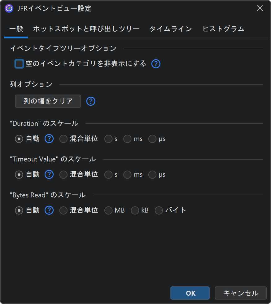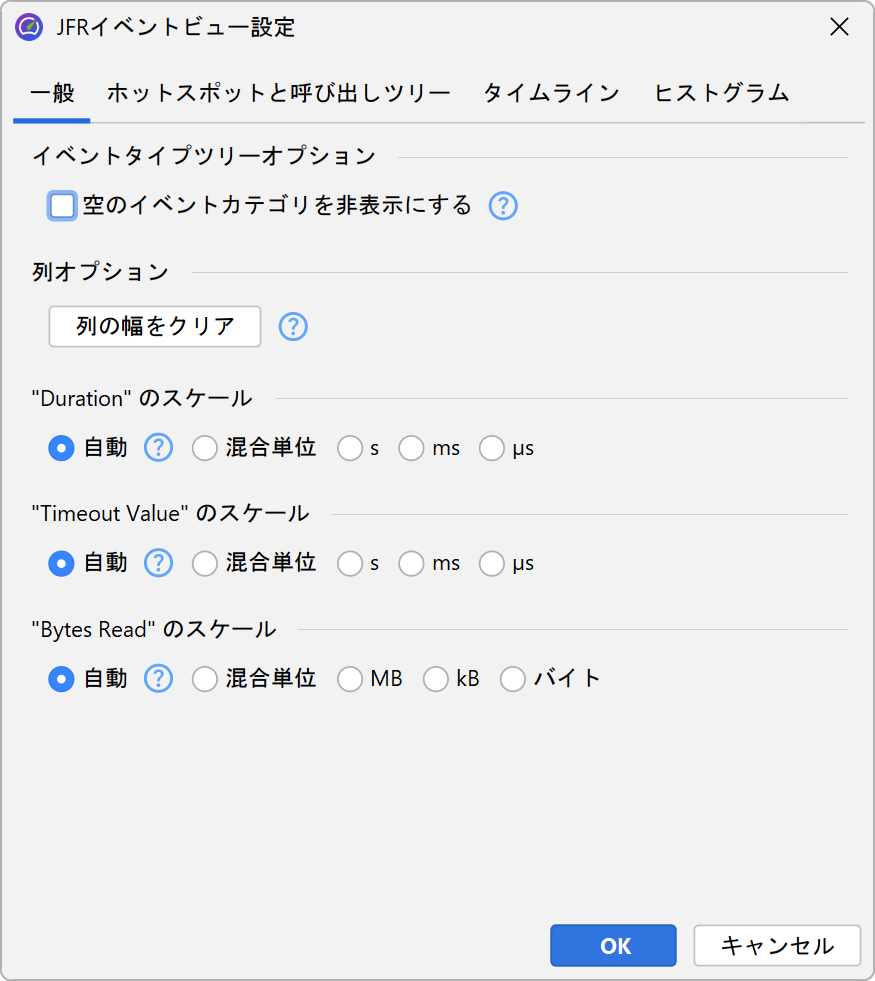 列の幅は、実際の内容に基づいて自動的に調整されますが、列をリサイズすると、同じ内容タイプの列の幅が選択に固定され、自動的に変更されなくなります。ビュー設定ダイアログで列の幅をクリアするまでです。時間やメモリのような単位を持つ列のスケールも各セルごとに自動的に計算されます。列のスケールを固定して比較しやすくする場合、ビュー設定ダイアログで各列に対してオプションが提供されます。この場合、設定は選択された各イベントタイプごとに個別に保存されます。