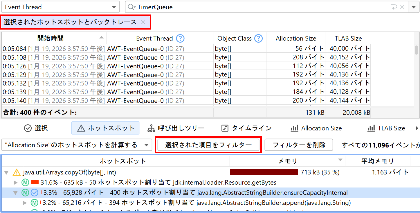 上のスクリーンショットでは、バックトレース内のノードがフィルターノードとして選択されていることがわかります。通常の呼び出しツリーアイコンに加えて、チェックマークも含まれています。フィルターは上部のタグラベルまたはフィルターを削除ボタンで削除できます。テーブル内のイベント数は選択されたノードの数と等しいです。ホットスポットツリーは、ホットスポットビューで設定されたフィルターなしですべてのイベントを表示し続けます。
