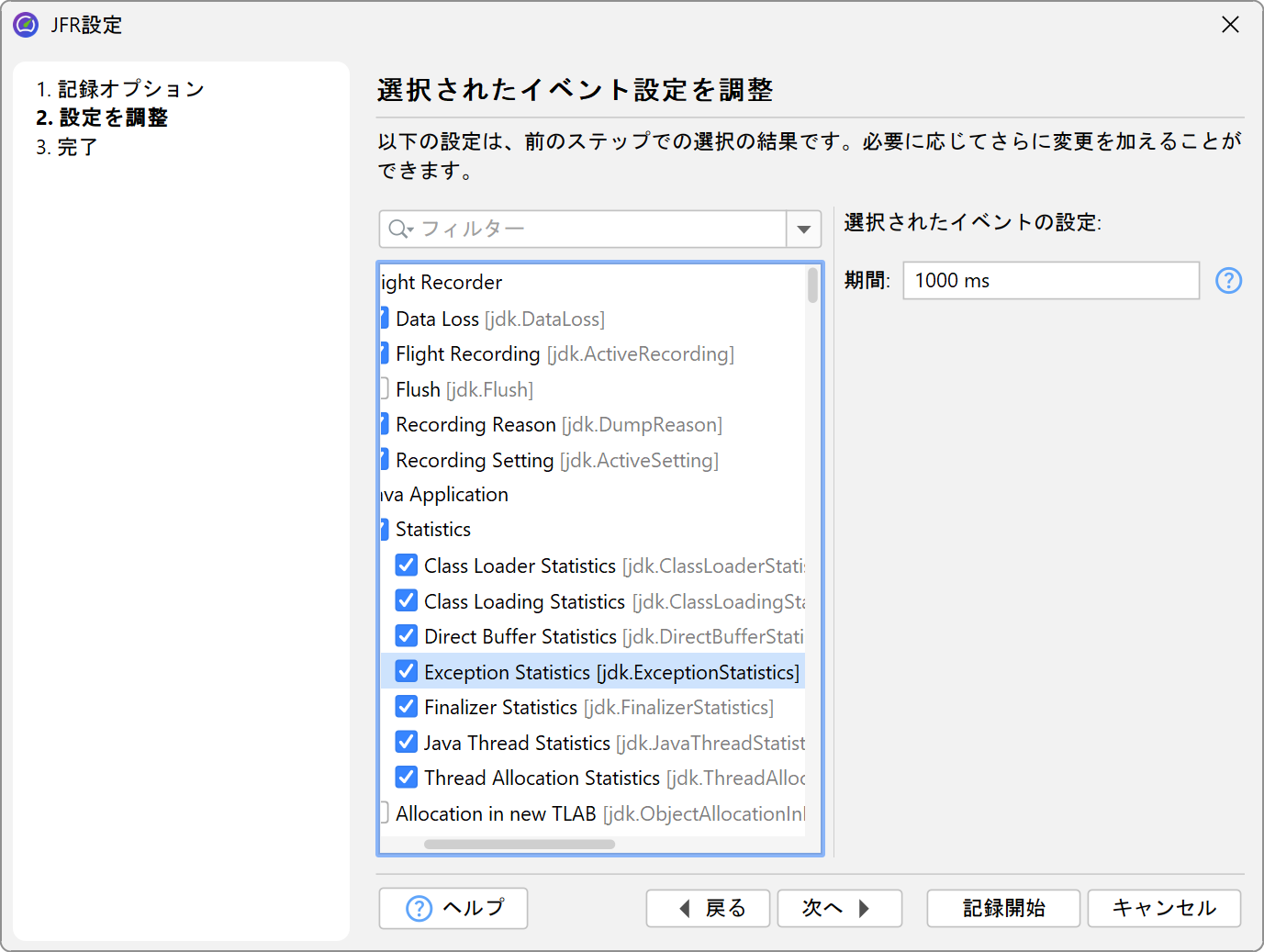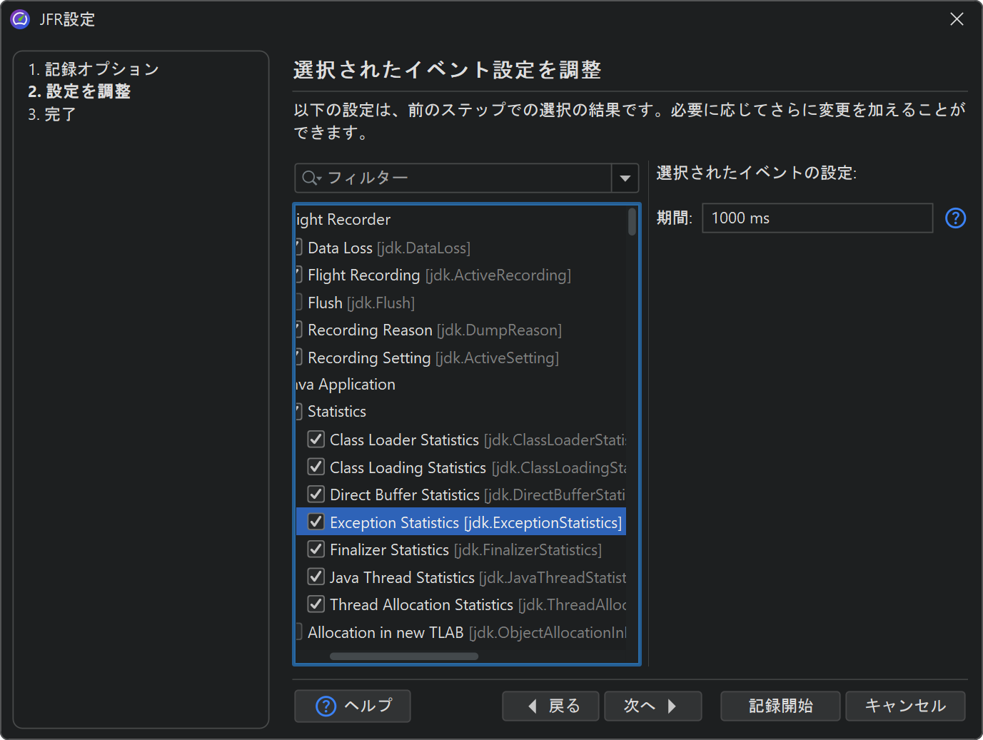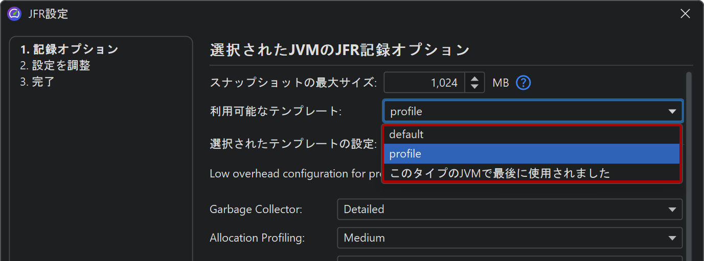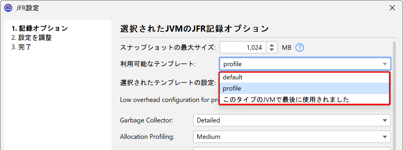 JFR設定ウィザードでは、選択したプロセスで使用されているJREのlib/jfrディレクトリから送信されるイベント設定テンプレートの1つを選択できます。デフォルトでは、「default」と「profile」という2つのテンプレートがあり、「profile」はより多くのデータを記録し、オーバーヘッドが増加します。