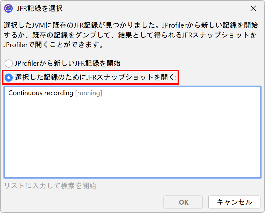 JVMテーブルの特別な背景色による指示は、JProfilerで開始されたJFR記録のみを指します。他の手段でJFR記録が開始されたJVMに接続すると、別のダイアログが表示されます。