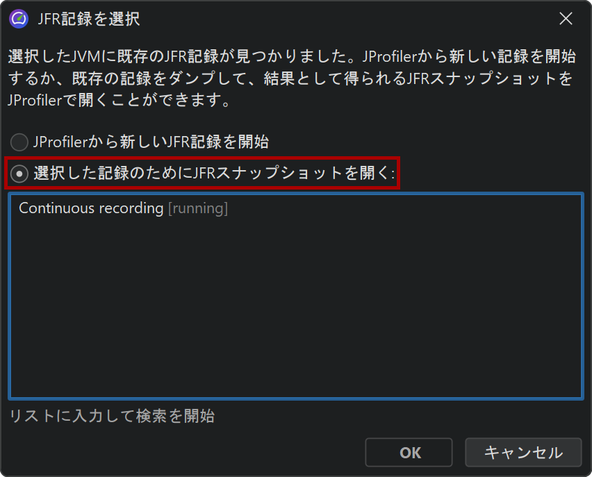 すでに同じイベントタイプのセットでJVMのJFR記録を開始している場合、JProfilerは最後の設定を使用するオプションを提供します。