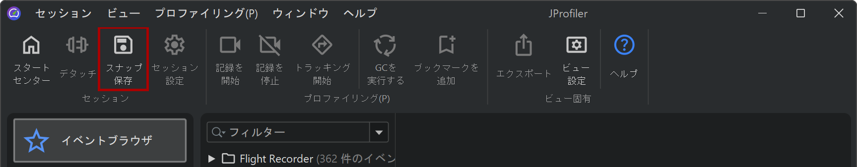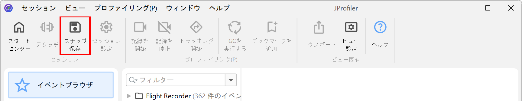 JProfilerによって開始されたJFR記録を停止すると、JFRスナップショットが転送され、JProfilerで開かれます。スナップショットは一時的であり、ウィンドウを閉じると削除されます。スナップショットを永続的な場所に保存するには、ツールバーの「スナップショットを保存」アクションを使用してください。