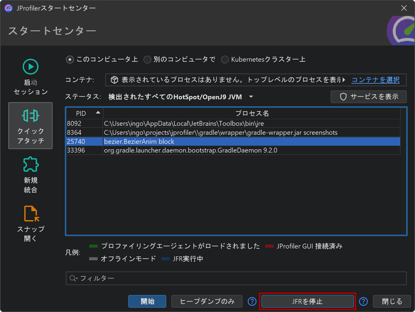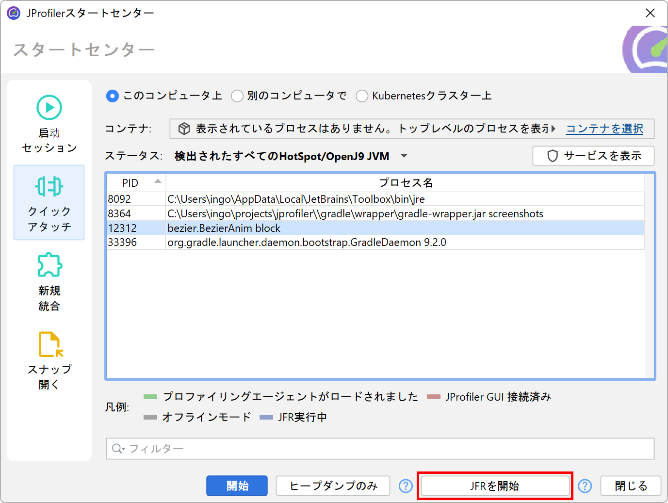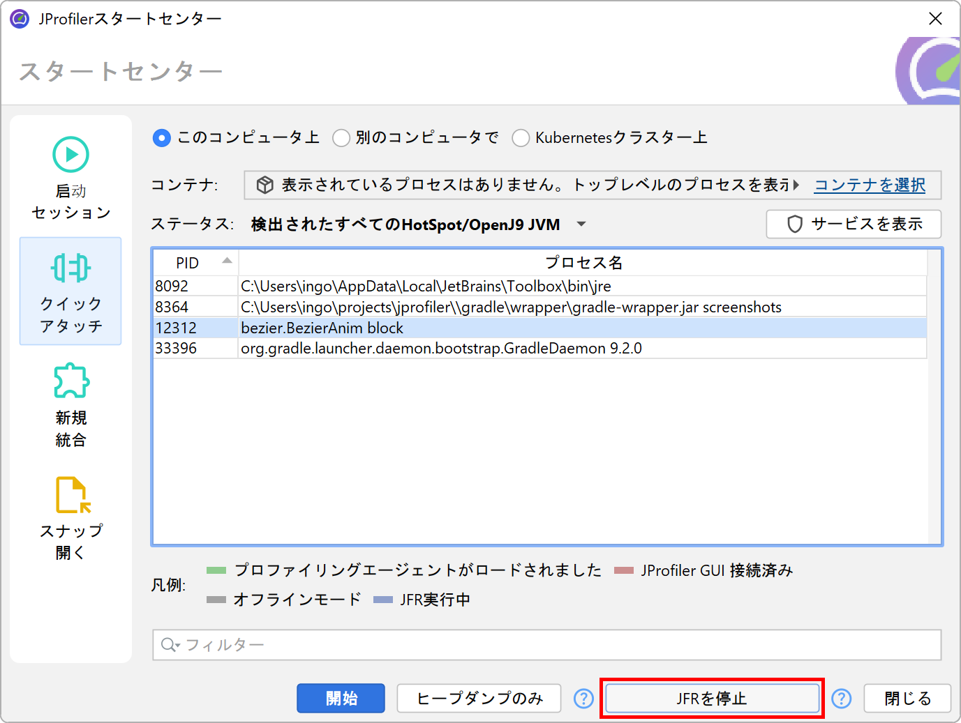JProfilerでJVMにアタッチする際、ネイティブプロファイリングエージェントをロードする代わりに、JFR記録を開始および停止することを選択できます。JProfilerの広範なリモート接続機能を使用すると、たとえば、DockerやKubernetesコンテナで実行されているJVMでJFR記録を開始することができ、コンテナを変更する必要はありません。