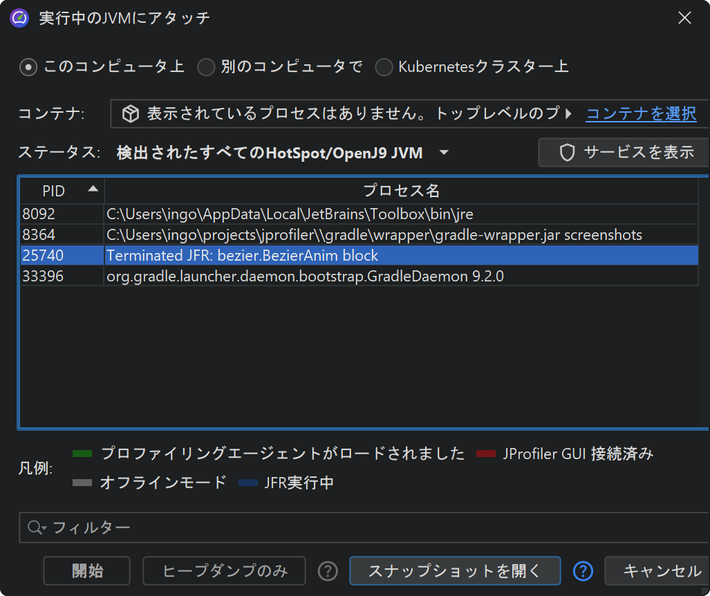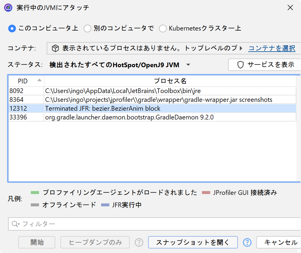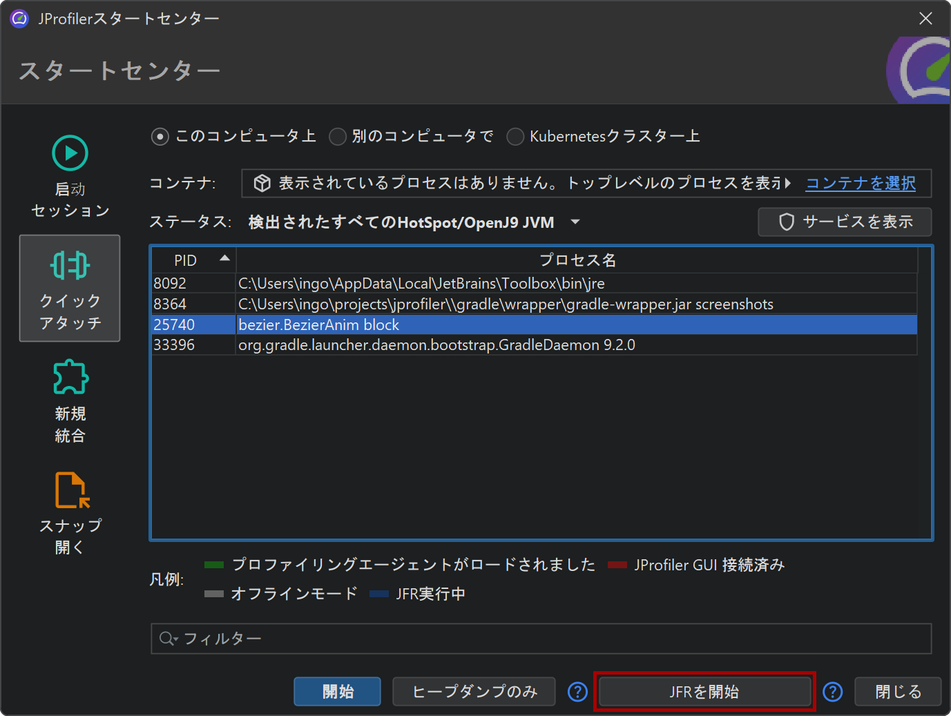 JProfilerでJVMにアタッチする際、ネイティブプロファイリングエージェントをロードする代わりに、JFR記録を開始および停止することを選択できます。JProfilerの広範なリモート接続機能を使用すると、たとえば、DockerやKubernetesコンテナで実行されているJVMでJFR記録を開始することができ、コンテナを変更する必要はありません。