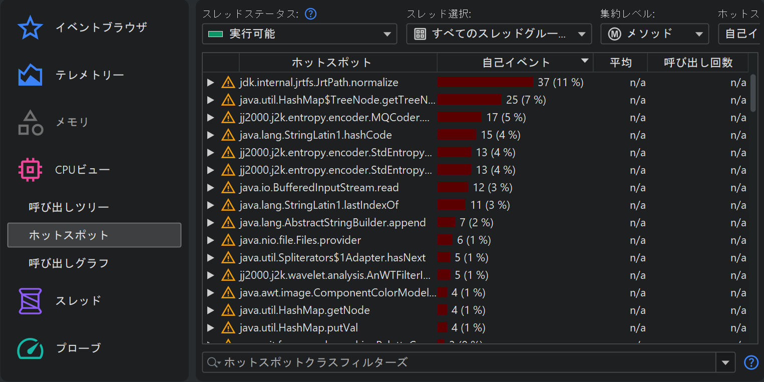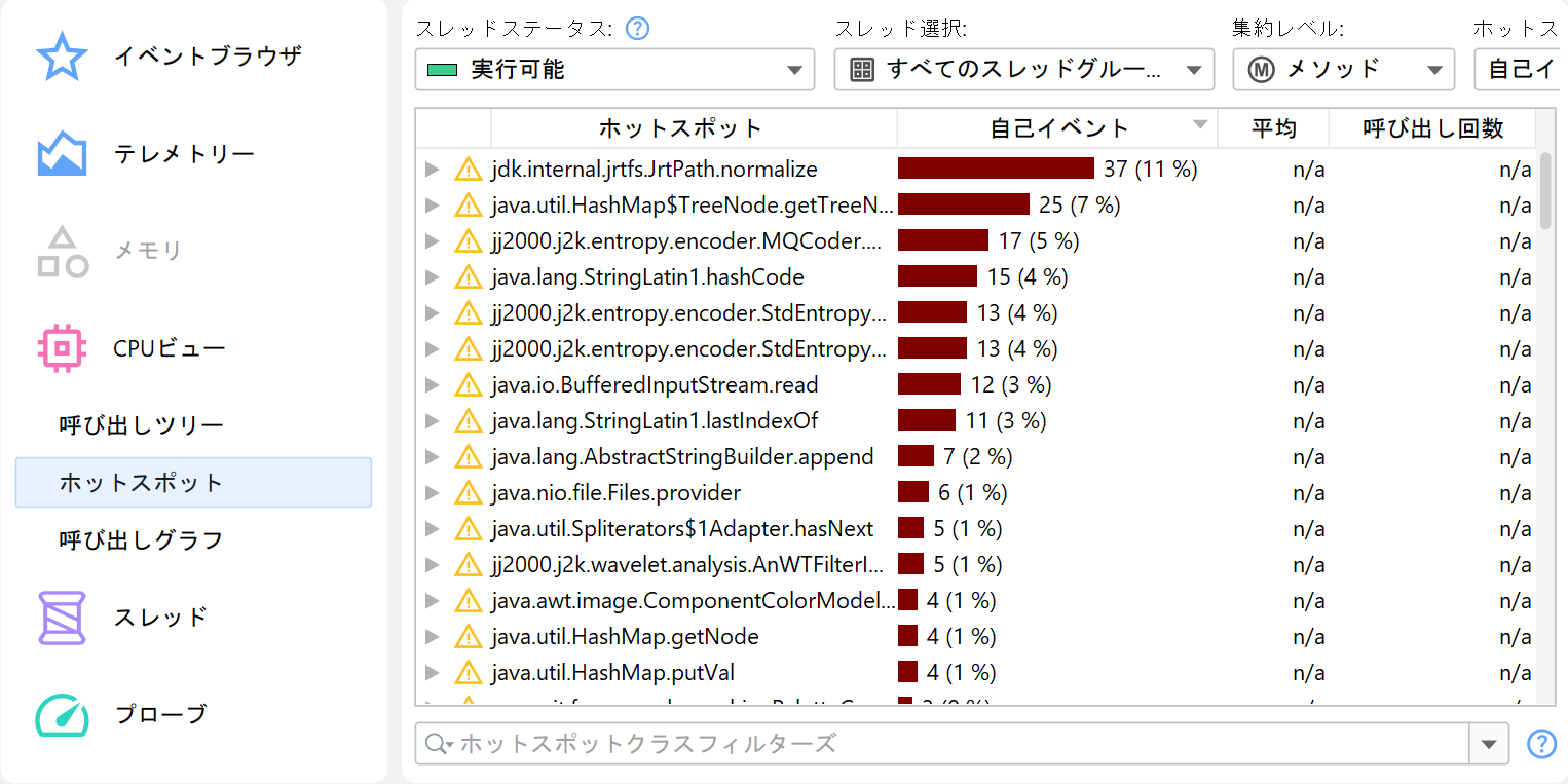 sampling」設定の「Normal」オプションに相当します。JFRはごく少数のランダムなスレッドしかサンプリングしないため、ホットスポットが十分に目立つようなデータを得るには非常に時間がかかる場合があります。必要に応じてjdk.ExecutionSampleの期間を短くすることを検討してください。ただし、JFRはデータを集約しないため、スナップショットサイズが非常に大きくなる可能性があります。