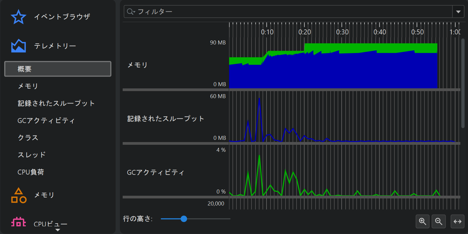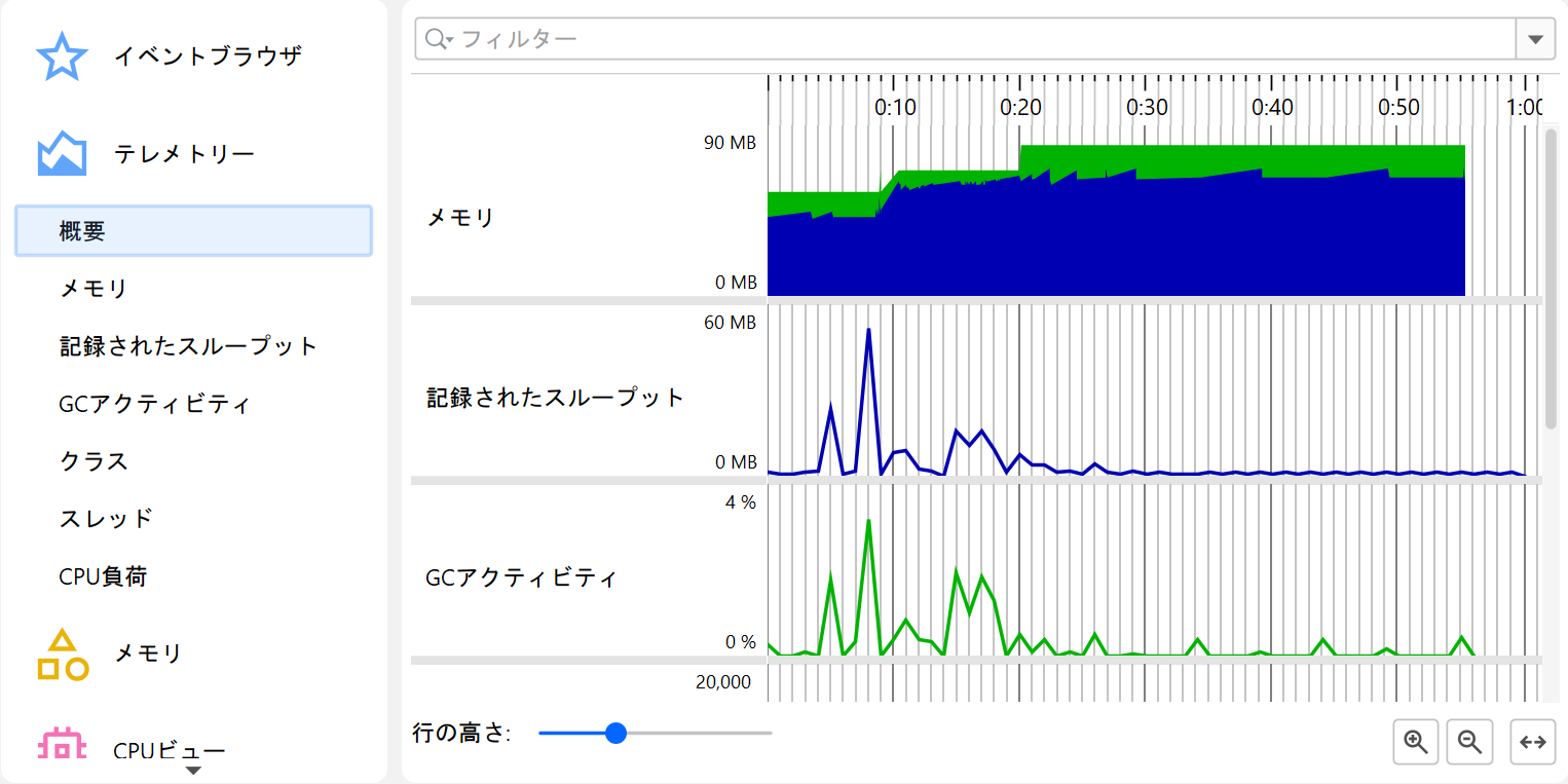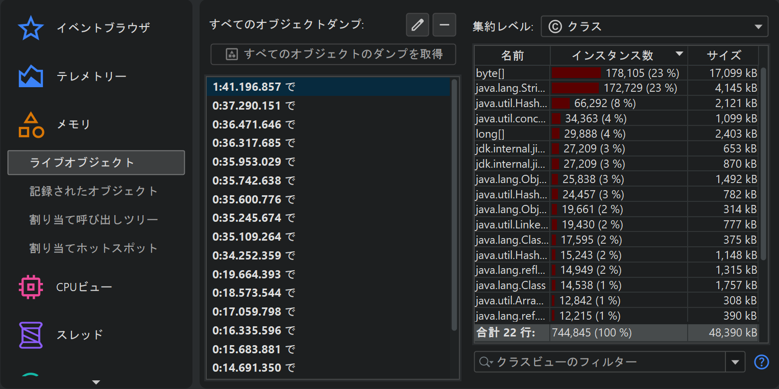 | 記録済みスループット | jdk.ObjectAllocationSample, jdk.ObjectAllocationInNewTLAB, jdk.ObjectAllocationOutsideTLAB | プロファイルのみ |