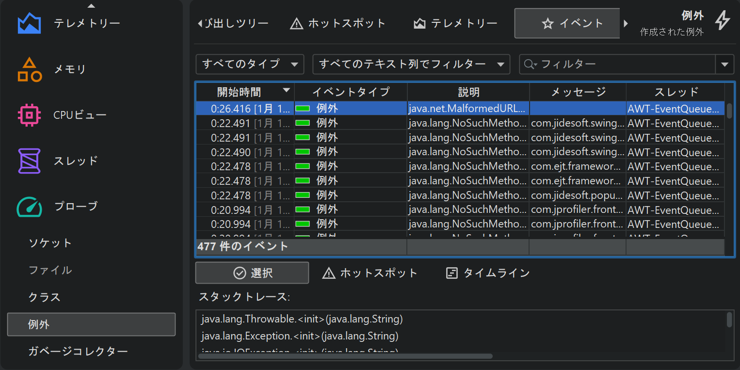 イベントビューはJFRブラウザのものと似ていますが、基となるJFRイベントに対応する複数のイベントタイプを表示し、タイプセレクターを提供します。フィルタリングやスタックトレースの表示(単一・複数選択)はイベントブラウザと同様に扱われます。また、時間やメモリ計測のヒストグラムビューもあり、横軸をドラッグして範囲選択が可能です。