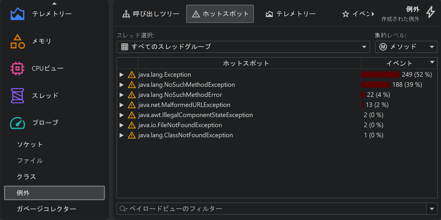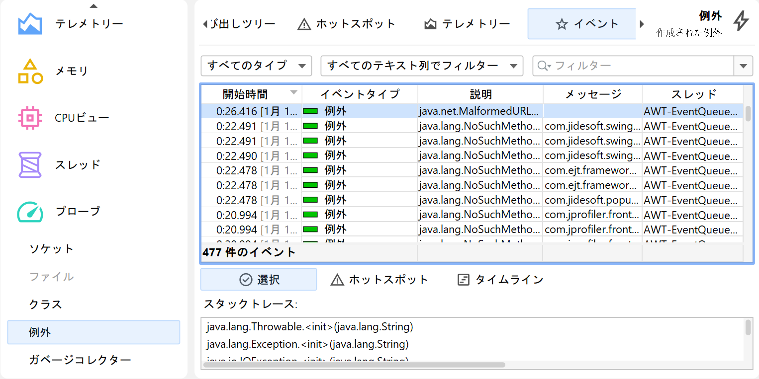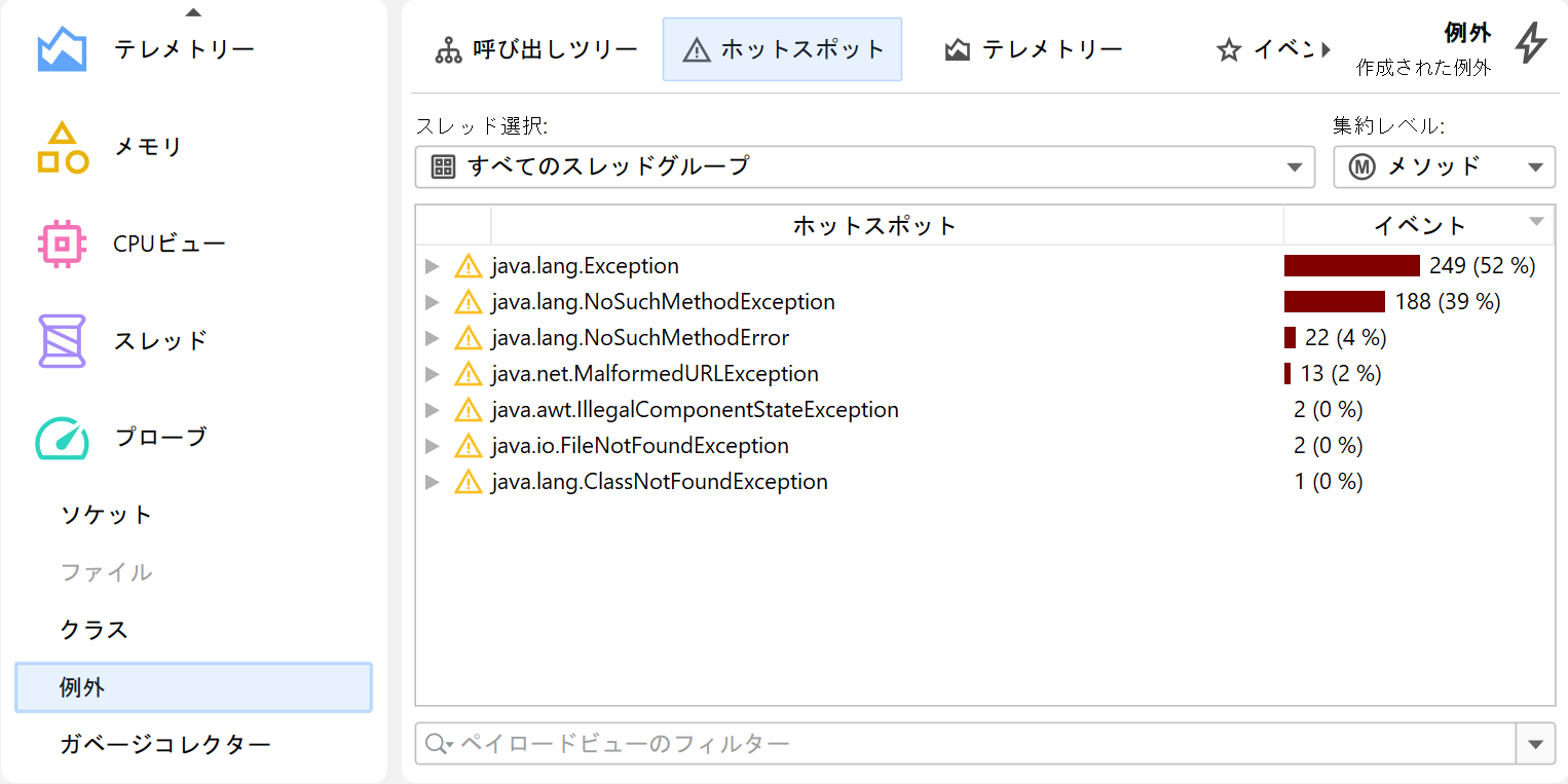 JFRイベントブラウザ以外にも、JProfilerはフルプロファイリングセッションで利用可能なビューの一部をJFRデータで表示します。これは、JFRがメモリ割り当てやメソッド実行のデータを収集するため可能となっています。主な制限は記録レートが低いことであり、問題となるホットスポットを特定するのに十分なデータを得るには時間がかかる場合があります。