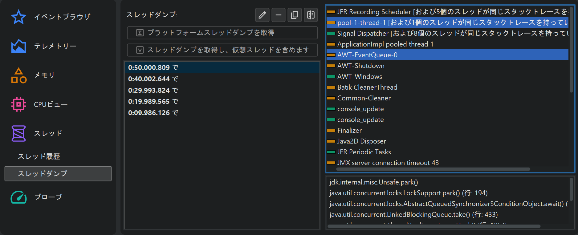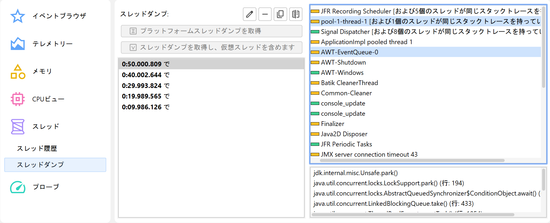スレッドダンプはJFRとJProfilerの両方で利用でき、同じビューで表示されます。この場合、イベントブラウザはスレッドダンプカラムの構造化された内容を表示できないため、代替にはなりません。スレッドダンプビューでは、異なるスレッドダンプの比較も可能です。