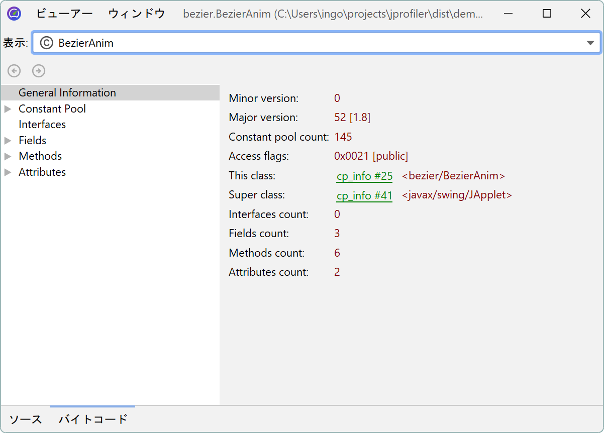 ソースコード表示とあわせて、 jclasslib bytecode viewer に基づくバイトコードビューアが、コンパイル済みクラスファイルの構造を表示します。
