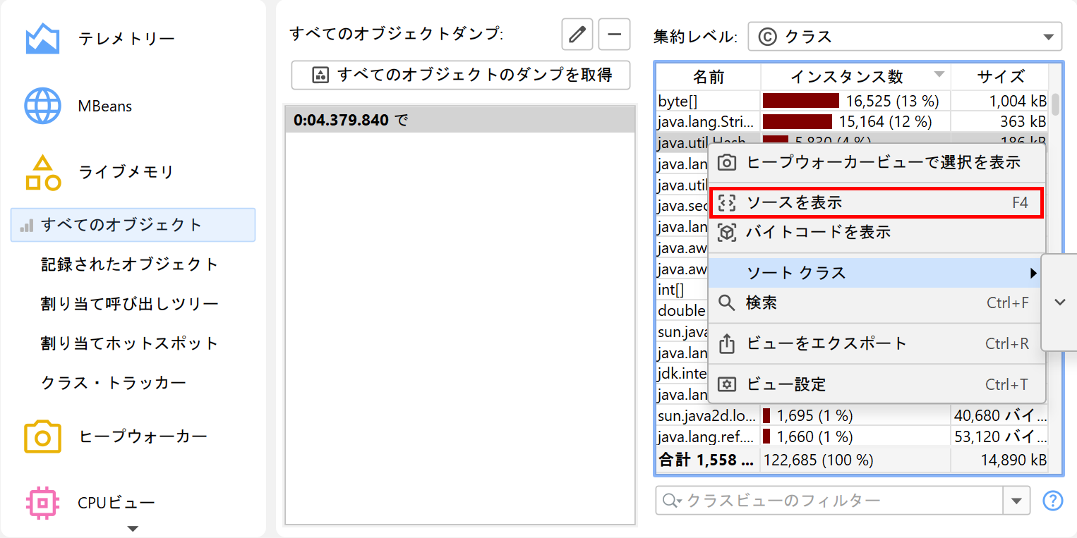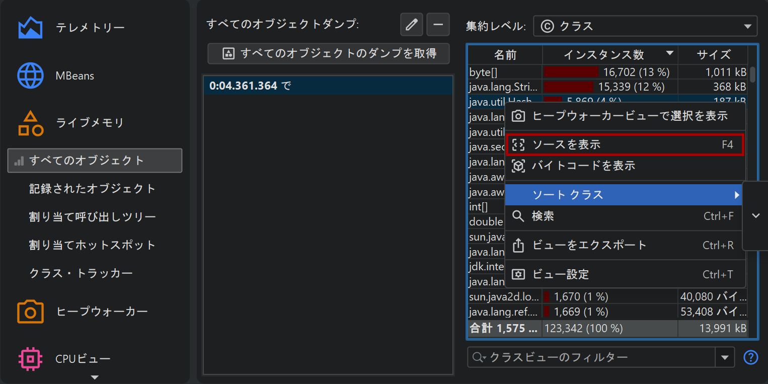 JProfiler内でクラス名やメソッド名が表示されている箇所では、コンテキストメニューにShow Sourceアクションが含まれています。
