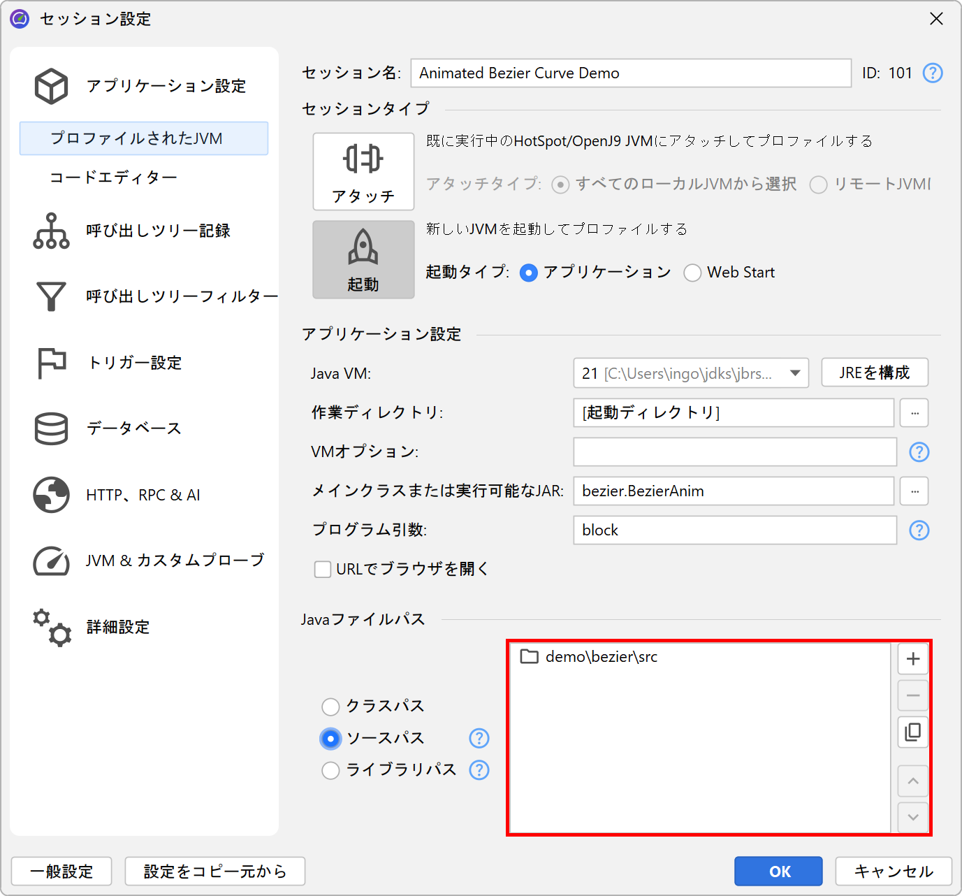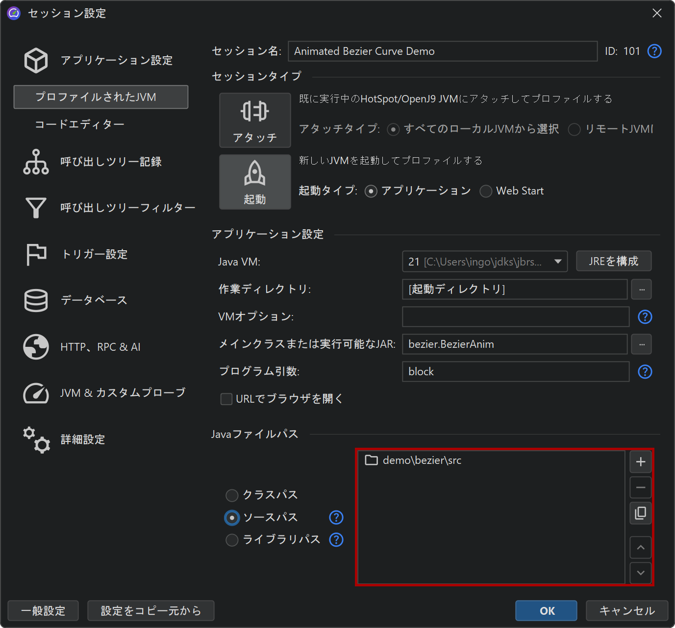 JProfilerはこのファイルに「profile-jprofiler」というターゲットを追加し、デバッグターゲットと同じ内容を設定し、