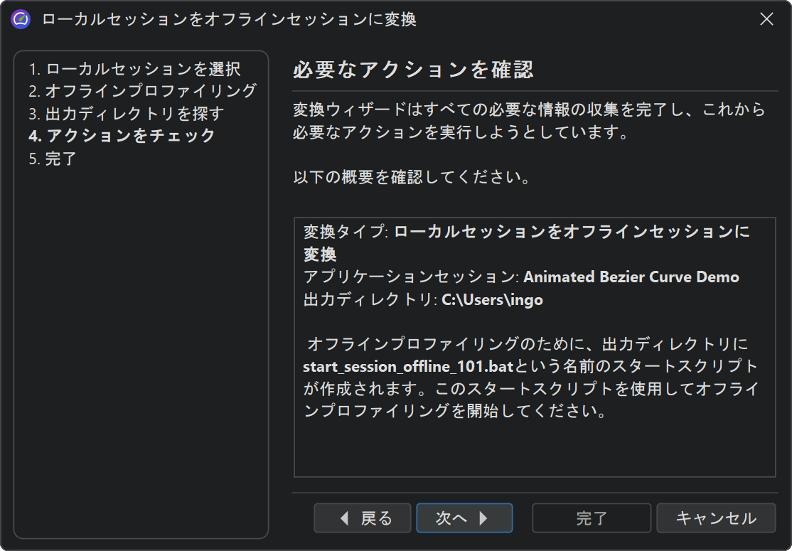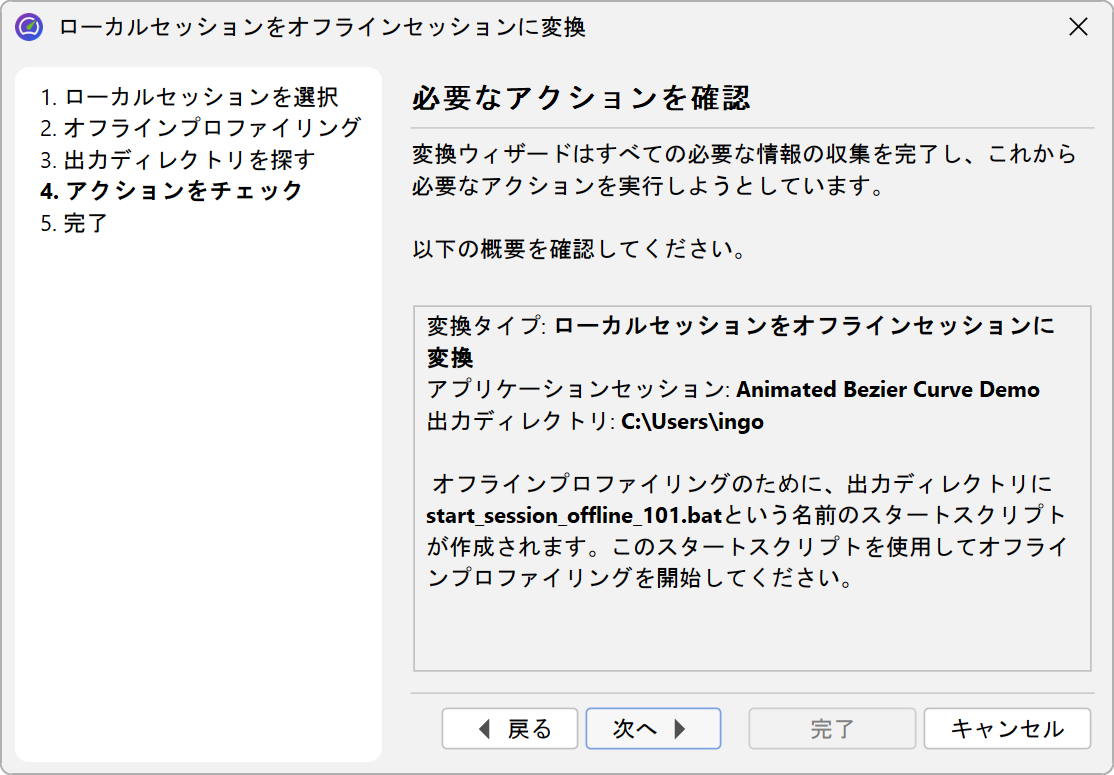 JProfilerで起動されたセッションを設定している場合、メインメニューからセッション→変換ウィザード→アプリケーションセッションをオフラインに変換を呼び出すことで、オフラインセッションに変換できます。これにより、適切なVMパラメータを持つ開始スクリプトが作成され、JProfiler UIで使用するのと同じセッションからプロファイリング設定が取得されます。呼び出しを別のコンピュータに移動したい場合は、セッション→セッション設定のエクスポートを使用してセッションを設定ファイルにエクスポートし、開始スクリプトのVMパラメータがそのファイルを参照していることを確認する必要があります。