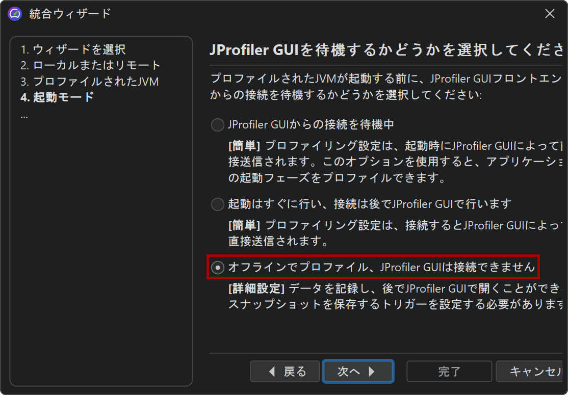 ライブラリパラメータとしてofflineを渡すと、オフラインプロファイリングが有効になります。この場合、JProfiler