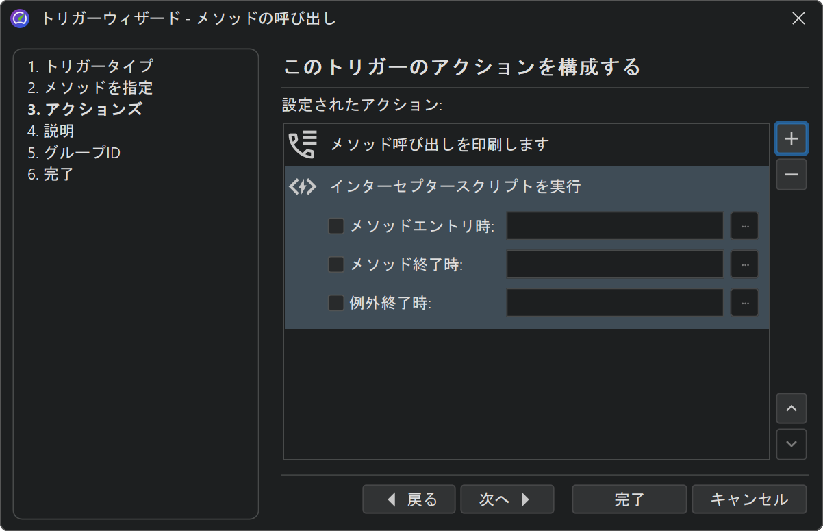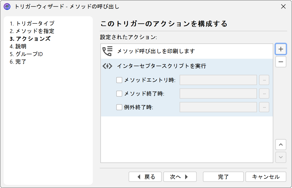 各トリガーには、関連するイベントが発生したときに実行されるアクションのリストがあります。これらのアクションの一部は、コントローラーAPIのプロファイリングアクションに対応しています。さらに、メソッド呼び出しをパラメータと戻り値と共に印刷するアクションや、メソッドのインターセプタースクリプトを呼び出すアクションなど、コントローラー機能を超える他のアクションもあります。