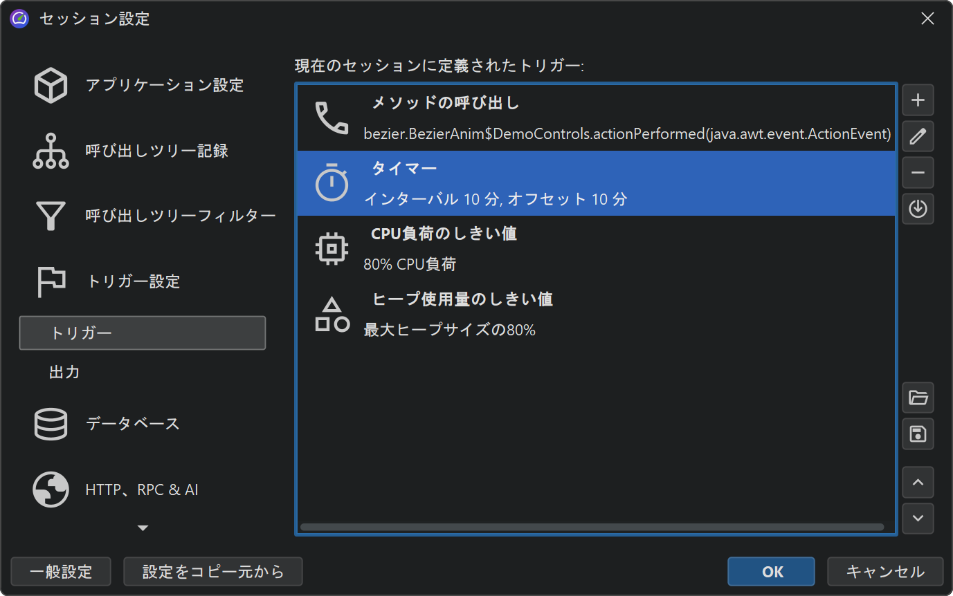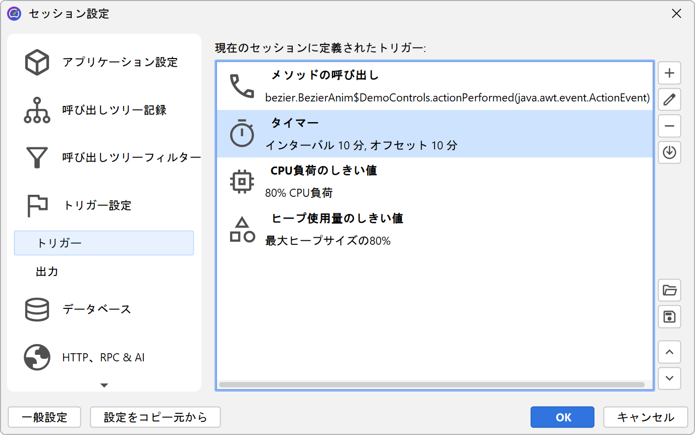 トリガーを使用すると、ソースコードを変更せずにJProfiler GUIでプロファイリングアクションをすべて指定できます。トリガーはJProfiler設定ファイルに保存されます。設定ファイルとセッションIDは、オフラインプロファイリングが有効になっている状態で開始するときにコマンドラインでプロファイリングエージェントに渡され、プロファイリングエージェントはそれらのトリガー定義を読み取ることができます。
