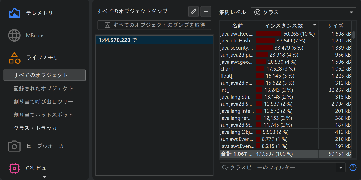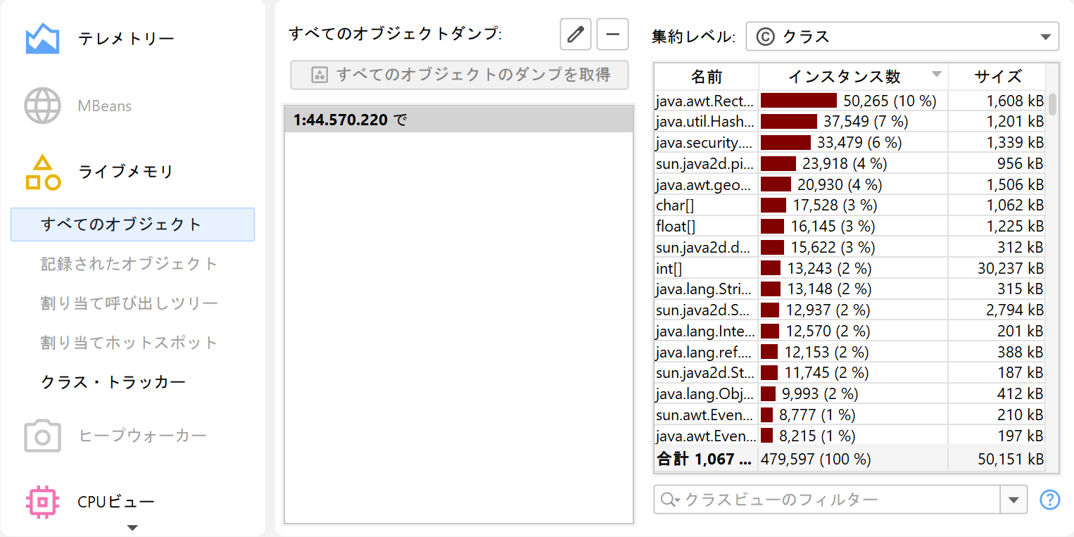 前の例を続けると、JProfilerはすべてのクラスのインスタンス数を表示できますが、時系列情報はありません。これは「すべてのオブジェクト」ビューであり、各クラスをテーブルの行として表示します。ビューの更新頻度は1秒に1回よりも低く、測定が引き起こすオーバーヘッドに応じて自動的に調整される場合があります。すべてのクラスのインスタンス数を決定することは比較的高価であり、ヒープ上のオブジェクトが多いほど時間がかかります。これが「すべてのオブジェクト」が自動的に更新されず、すべてのオブジェクトの新しいダンプを手動で作成する必要がある理由です。