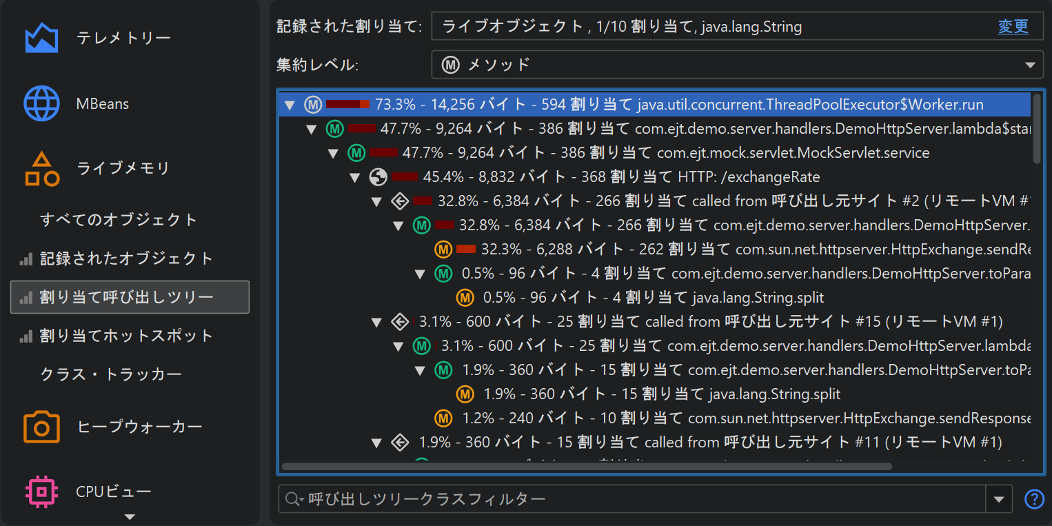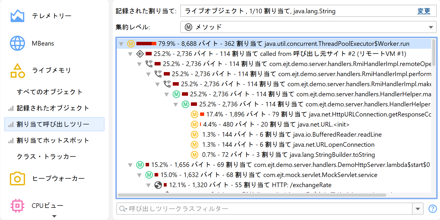割り当て記録は、割り当てられたインスタンスの数だけでなく、割り当てスタックトレースも記録します。各割り当て記録のスタックトレースをメモリに保持することは過剰なオーバーヘッドを生むため、JProfilerは記録されたスタックトレースをツリーに累積します。これにより、データをはるかに簡単に解釈できるという利点もあります。ただし、時系列の側面は失われ、データから特定の時間範囲を抽出する方法はありません。