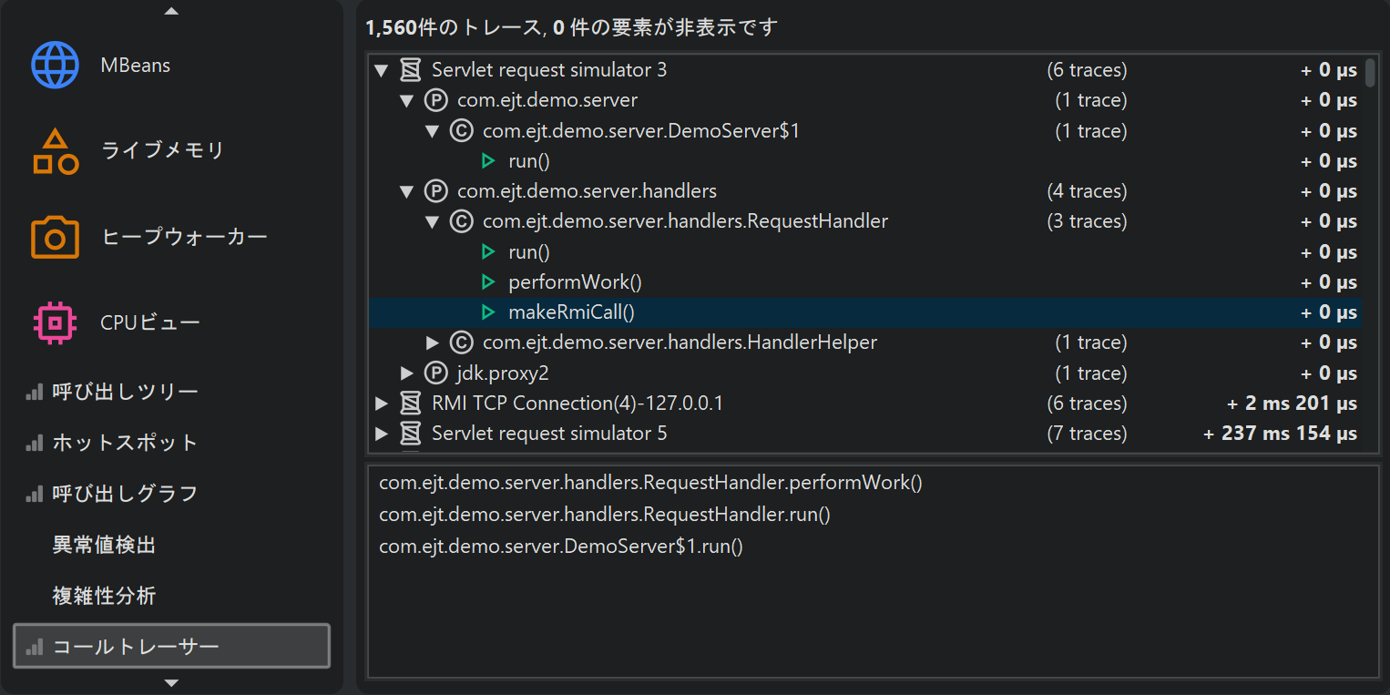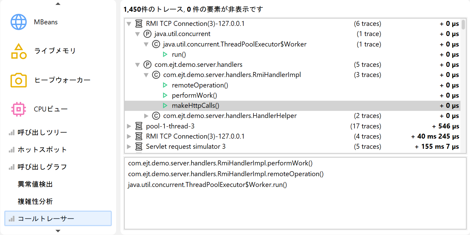 特定の状況下では、特に複数のスレッドが関与している場合、メソッドコールの時系列を確認することが有用です。これらの特別なケースのために、JProfilerは「コールトレーサー」ビューを提供します。このビューには、より一般的なCPU記録に結び付けられていない別の記録タイプがあります。コールトレーサーは、パフォーマンス問題を解決するのに役立つデータを生成しすぎるため、特定の形式のデバッグのみに使用されます。