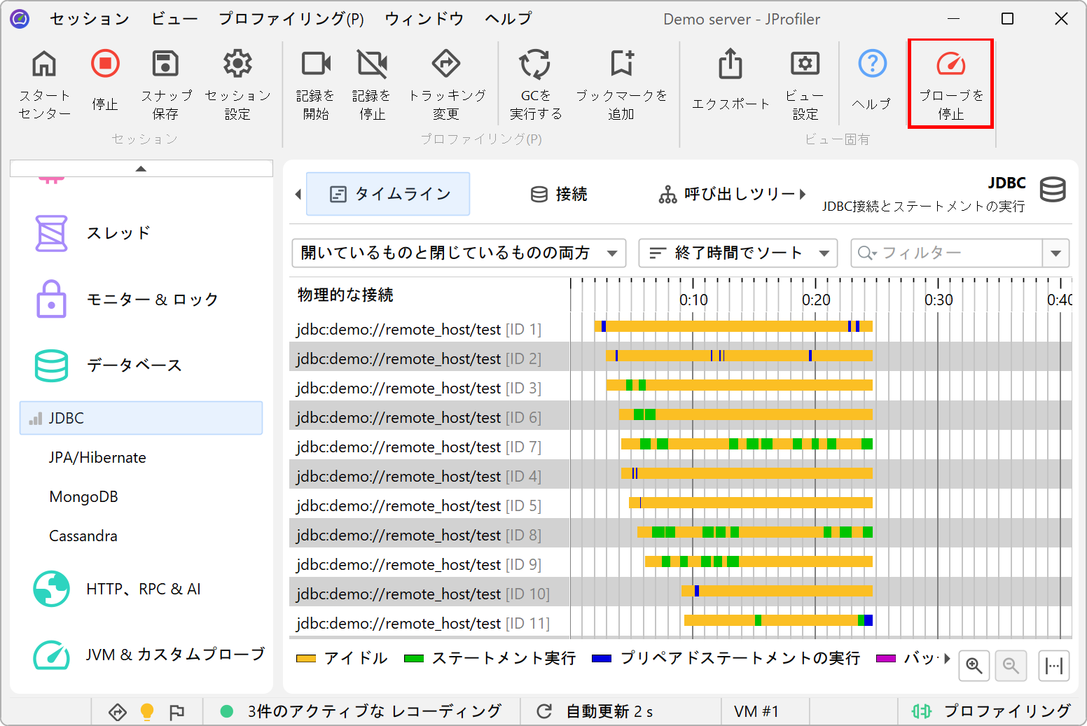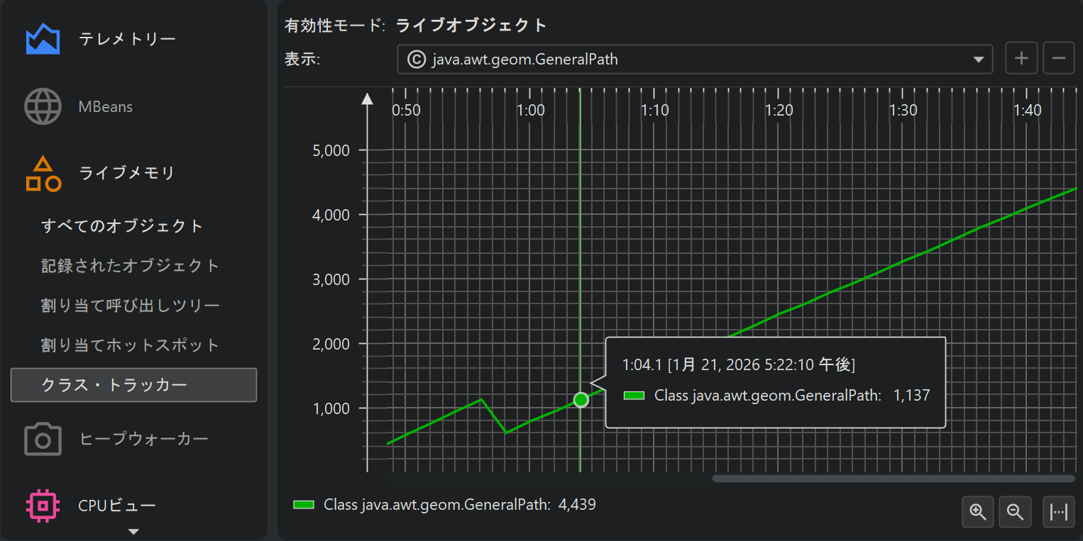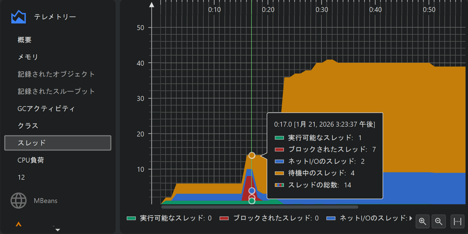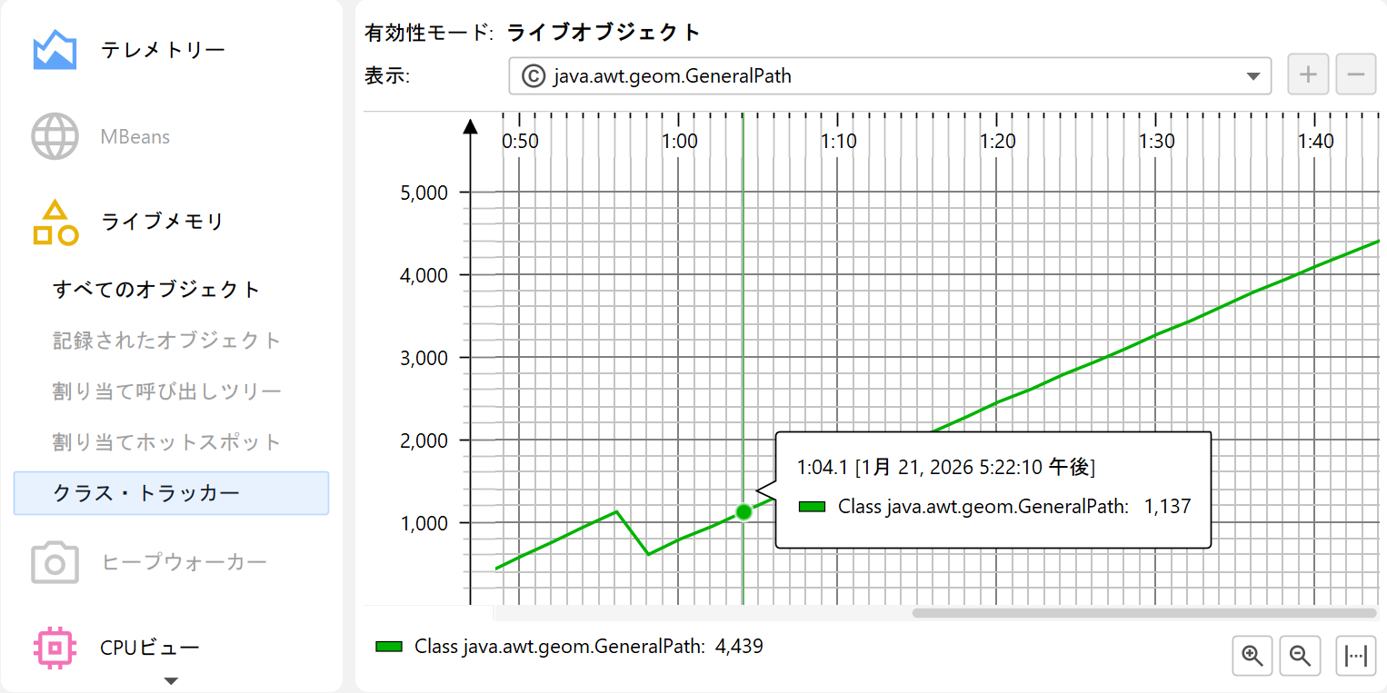 プロファイラの観点から、最も問題の少ないデータ形式はスカラー値です。たとえば、アクティブなスレッドの数やオープンなJDBC接続の数です。JProfilerは通常1秒に1回の固定されたマクロ的な頻度でそのような値をサンプリングし、時間の経過に伴う変化を表示できます。JProfilerでは、そのようなデータを表示するビューはテレメトリーと呼ばれます。ほとんどのテレメトリーは常に記録されます。なぜなら、測定のオーバーヘッドとメモリ消費が小さいからです。データが長時間記録される場合、古いデータポイントは統合され、メモリ消費が時間とともに線形に増加しないようにします。